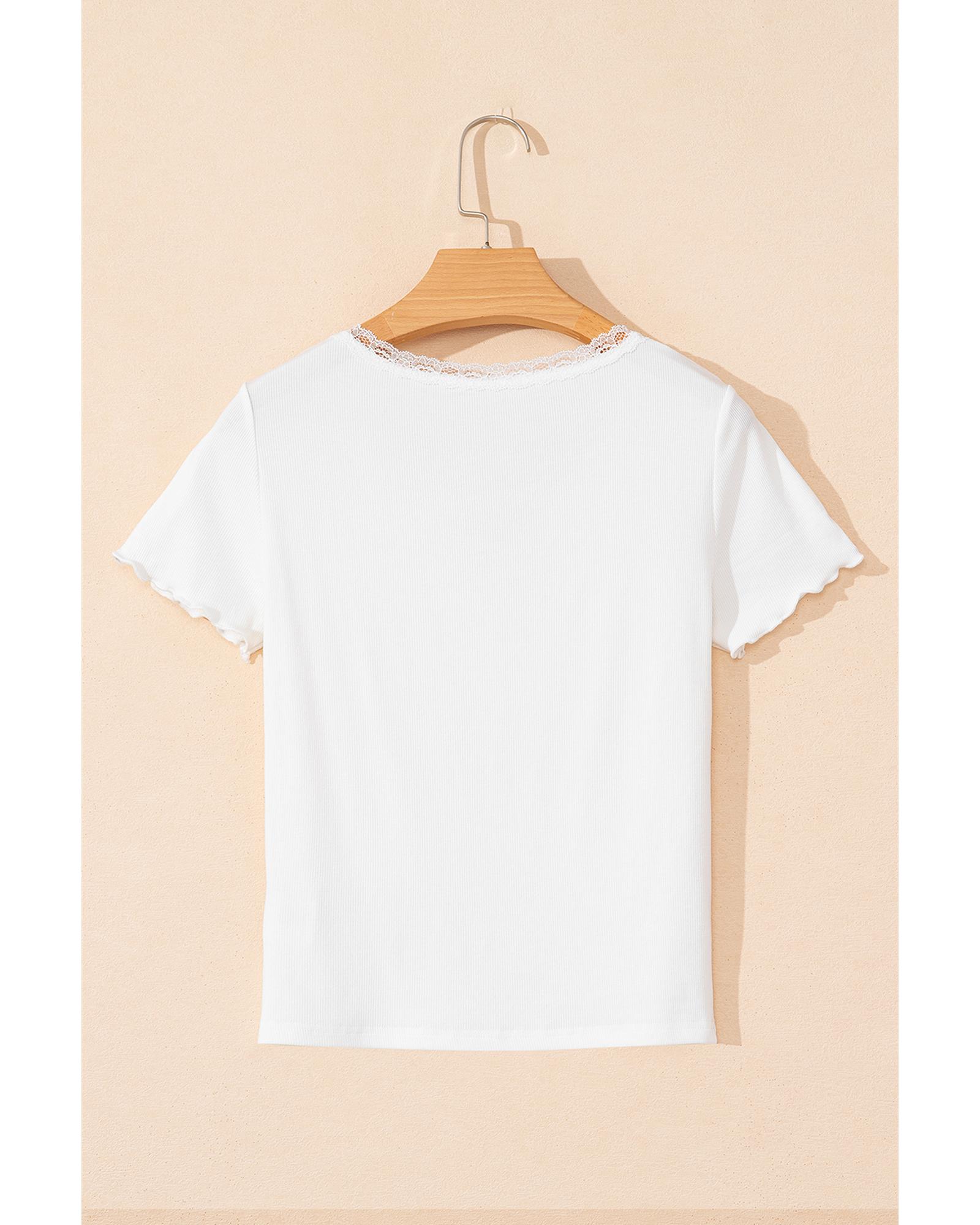 This white lace V neckline ribbed slim fit T shirt combines delicate lace details with a sleek, fitted silhouette. It features feminine lettuce sleeves and versatile styling options suitable for both casual and dressy occasions.