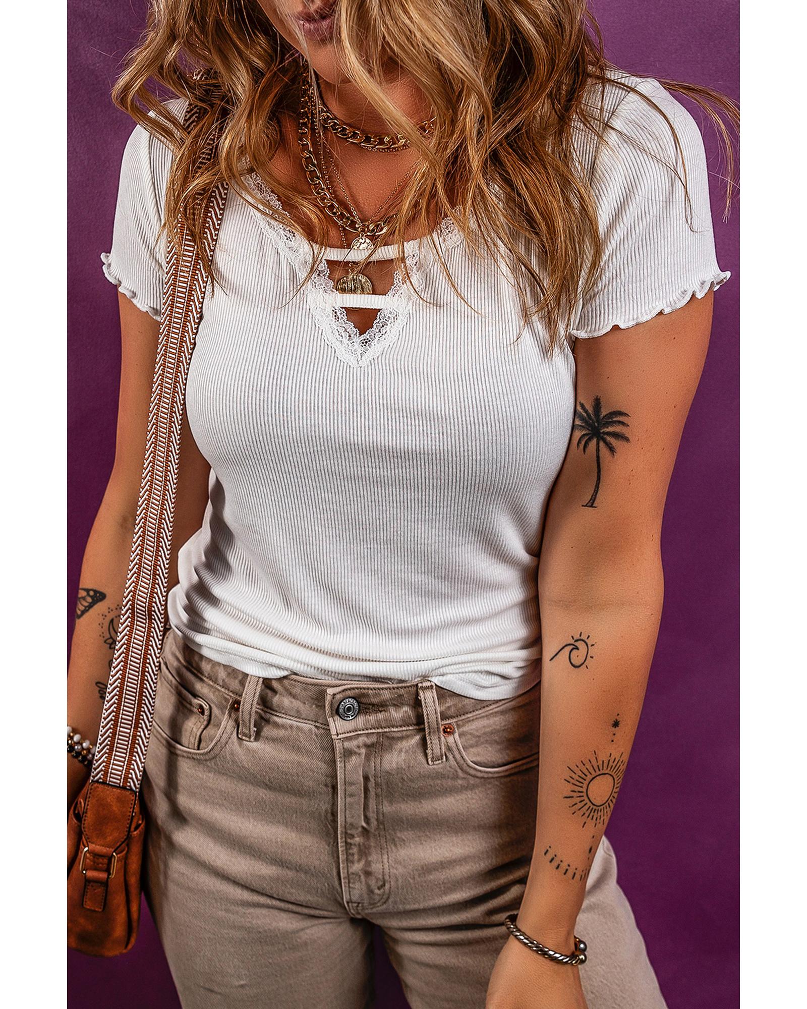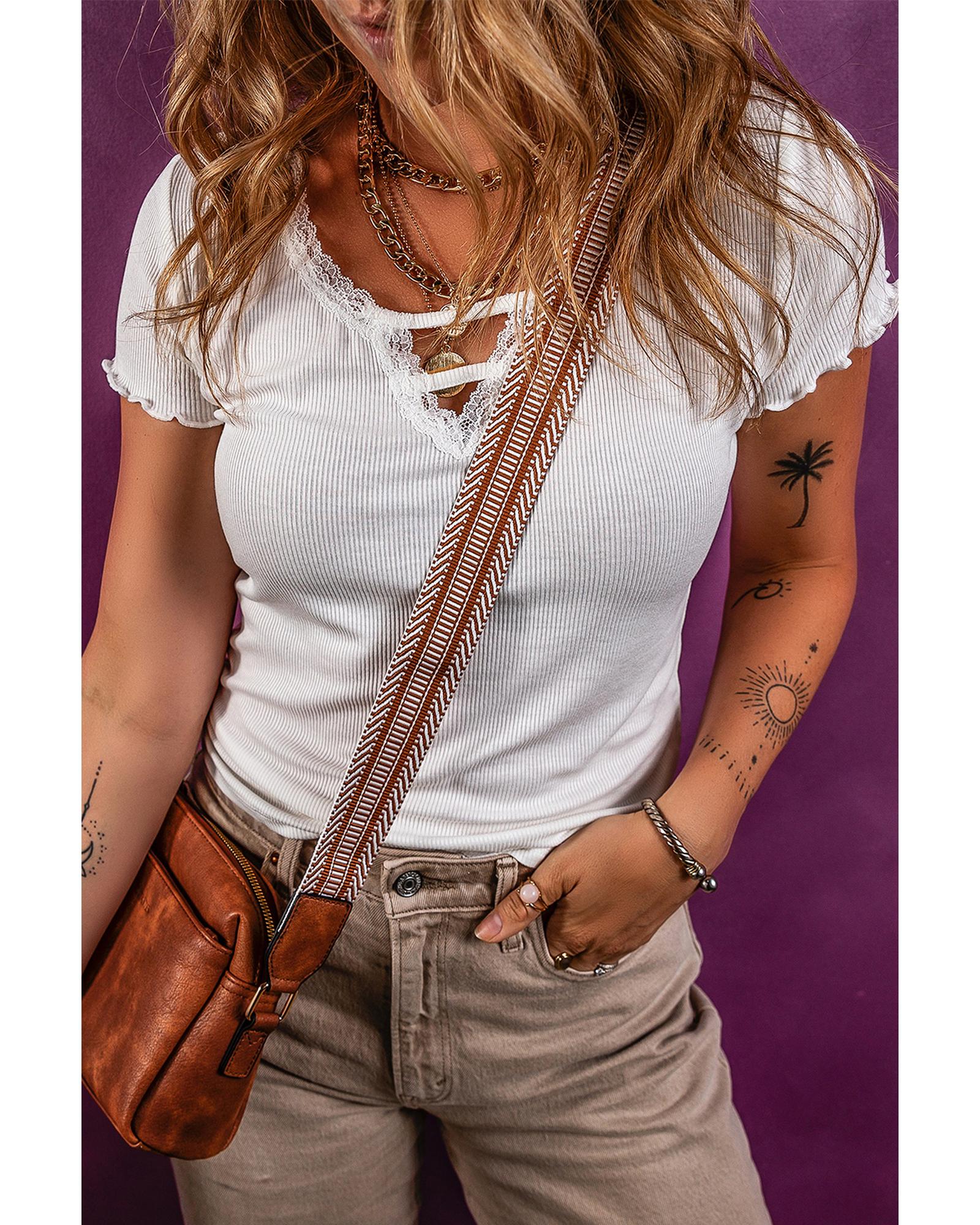 This white lace V neckline ribbed slim fit T shirt offers a delicate and stylish look with its feminine design. Crafted from a comfortable ribbed knit fabric, it provides a slim and fitted silhouette suitable for various occasions. The lettuce sleeves add a chic touch, making it a versatile piece for both casual and dressy outfits.
