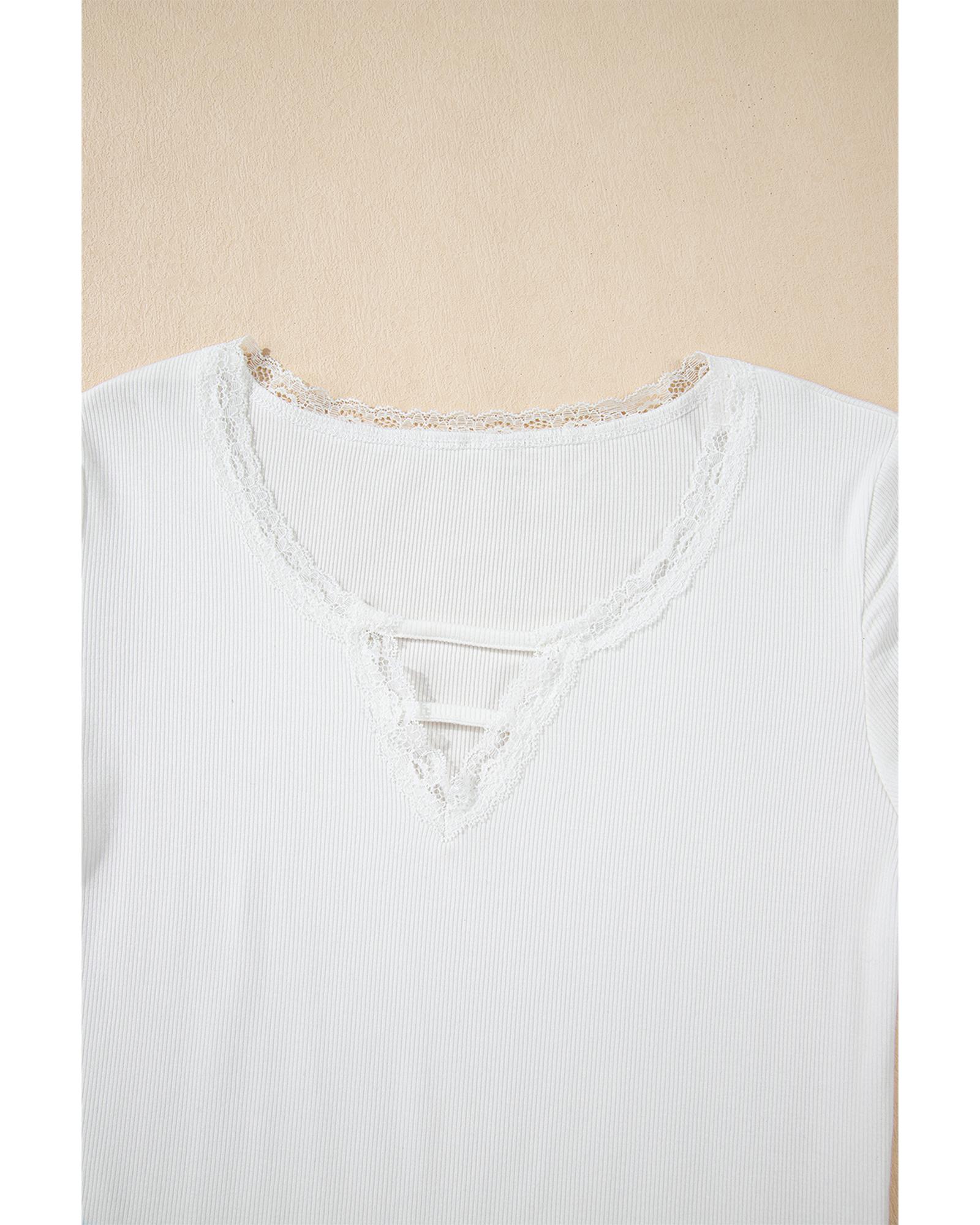 Package Content: 1 x White Lace V Neckline Ribbed Slim Fit T Shirt