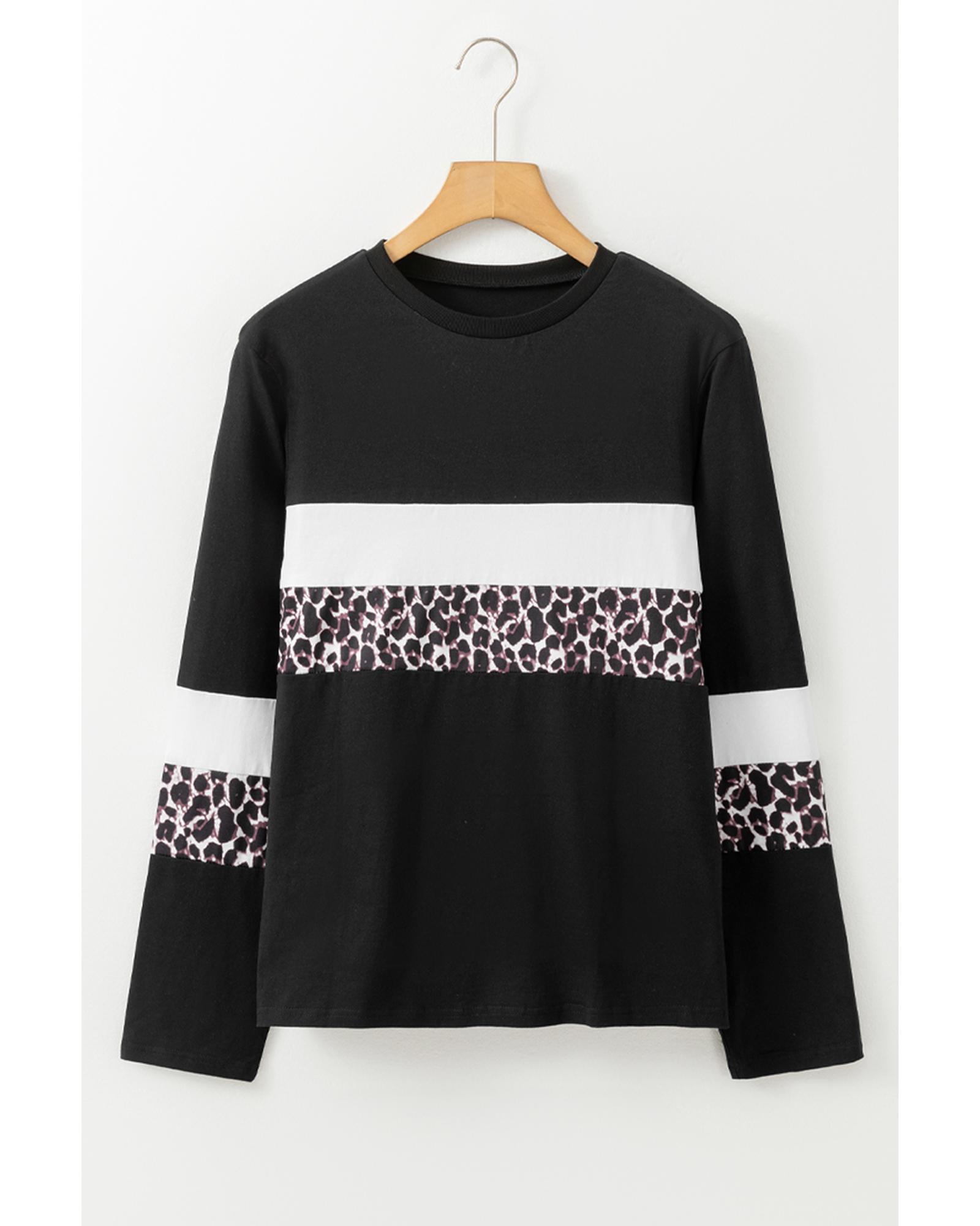 White Leopard Colorblock Patchwork Crew Neck Long Sleeve Tee – L