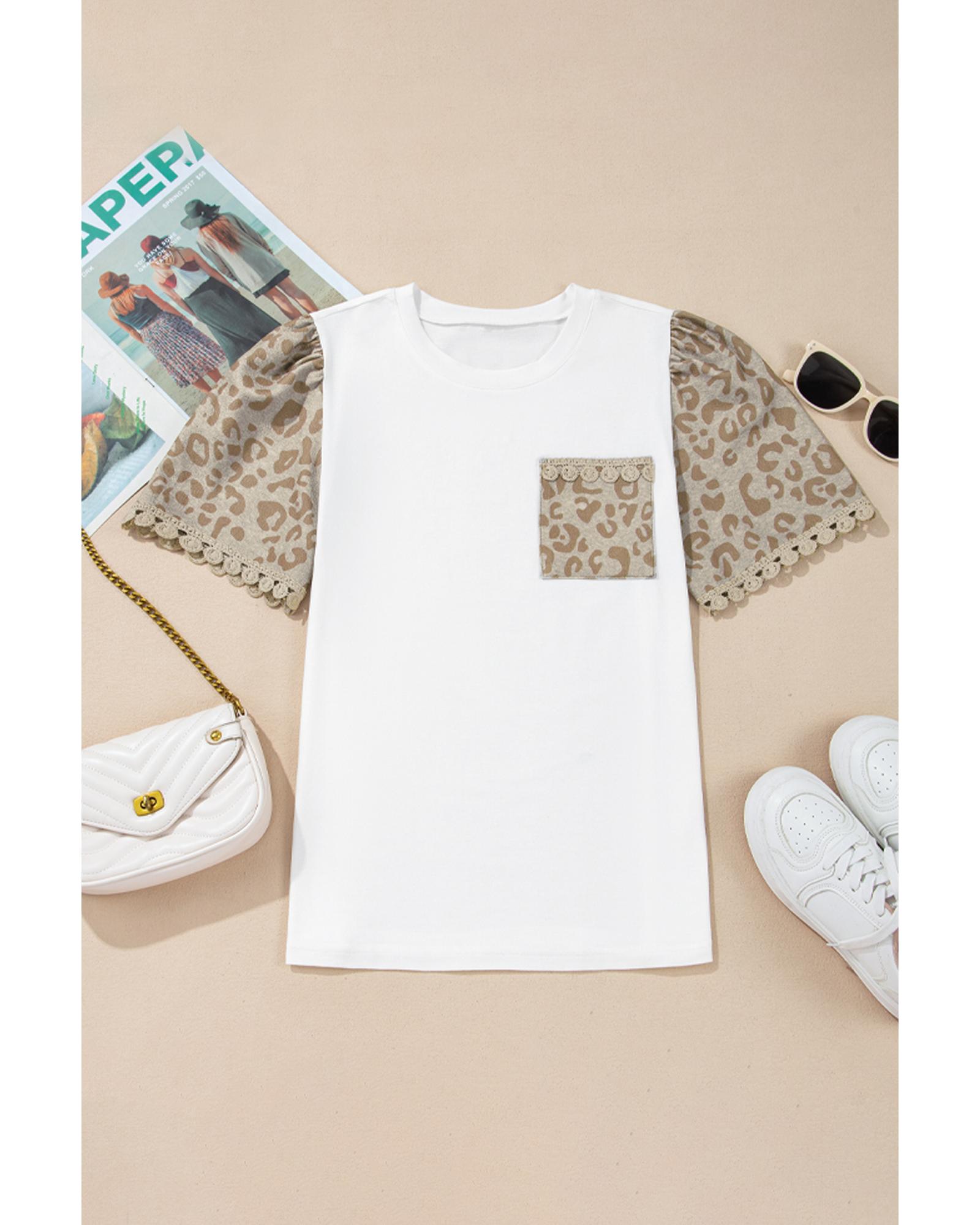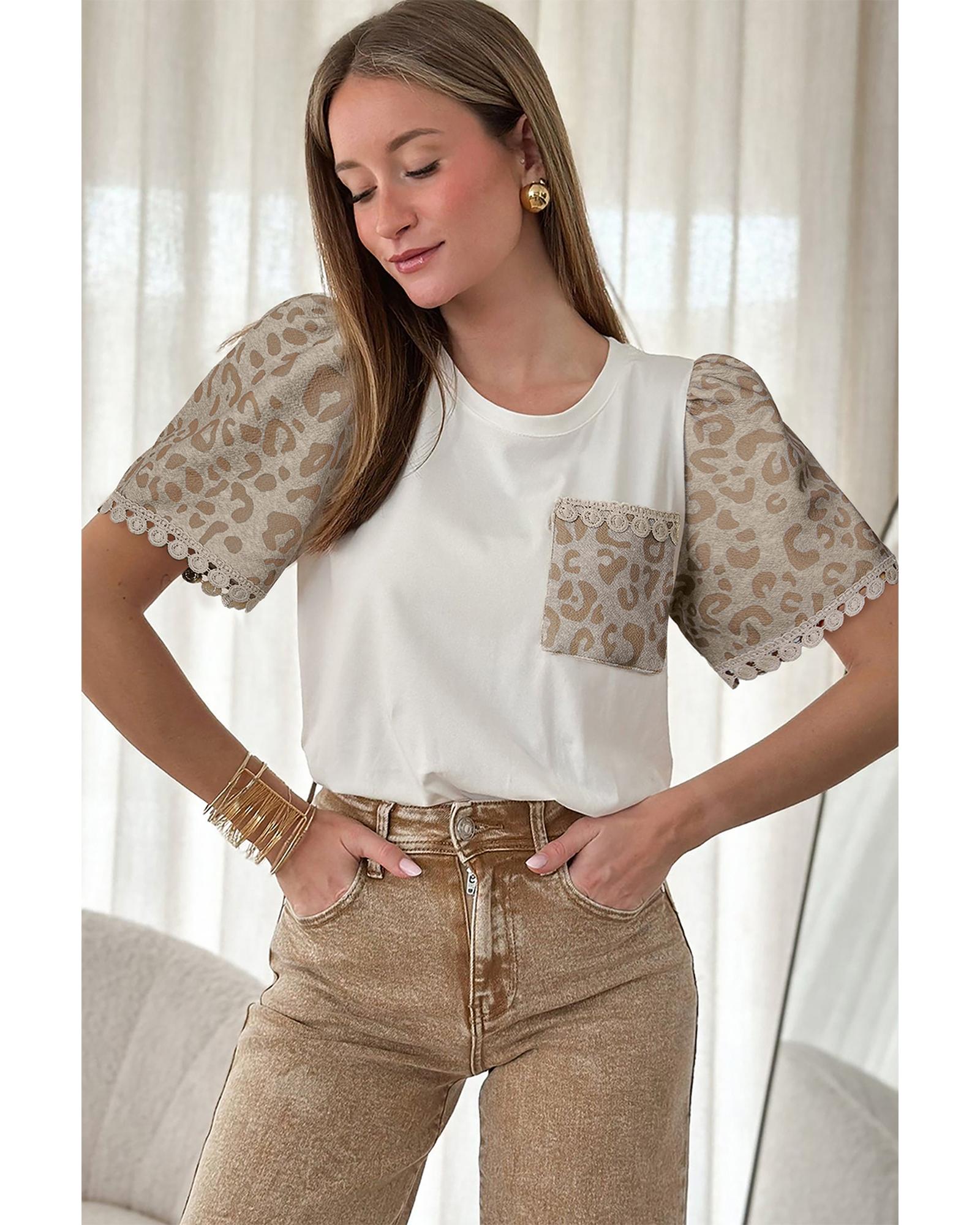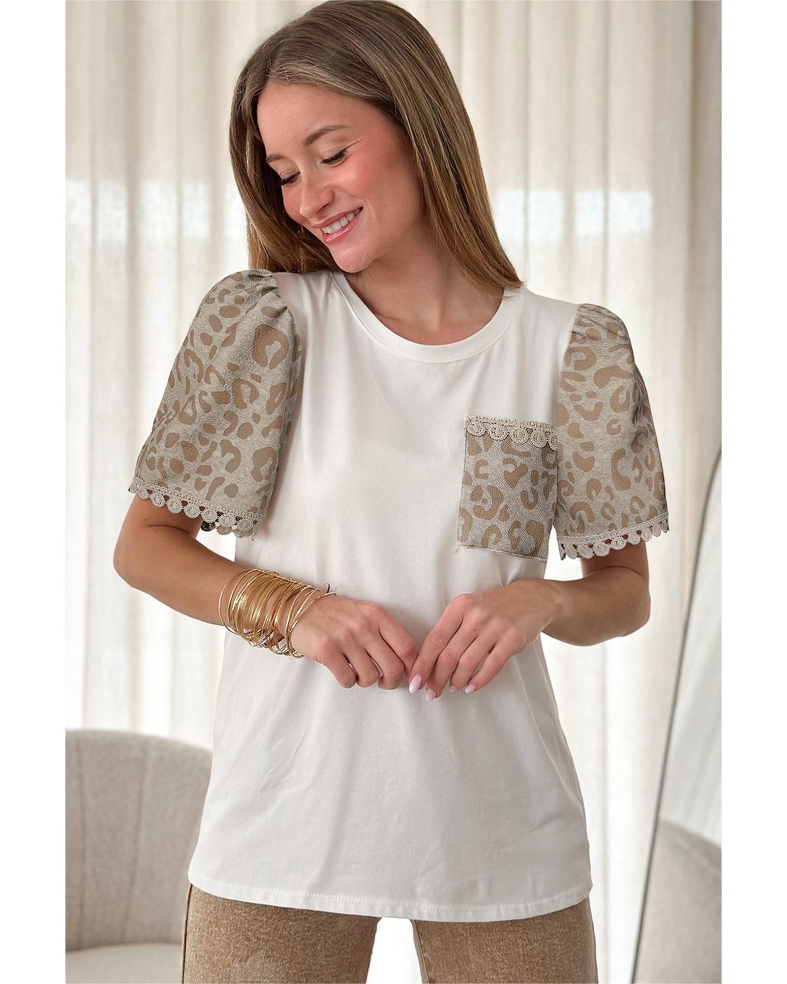 This T-shirt features a bold leopard print patchwork design combined with delicate crochet lace trim, creating a stylish and playful look. The puff sleeves add a touch of charm, while the classic crew neck ensures versatility. A functional chest pocket enhances practicality, and the high elasticity fabric provides a comfortable fit for everyday wear.