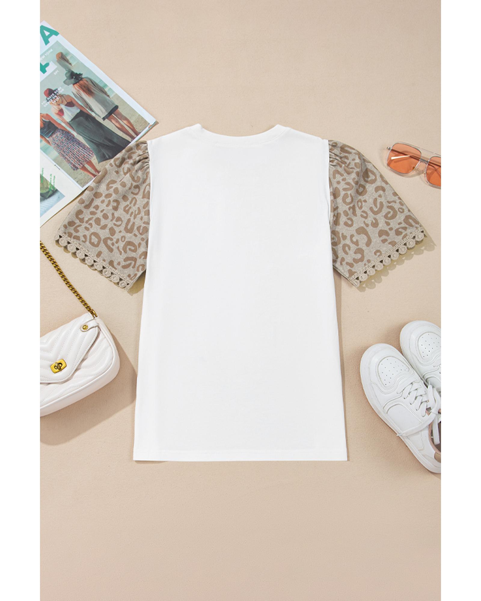 White Leopard Patchwork Crochet Lace Trim Puff Sleeve T Shirt – S