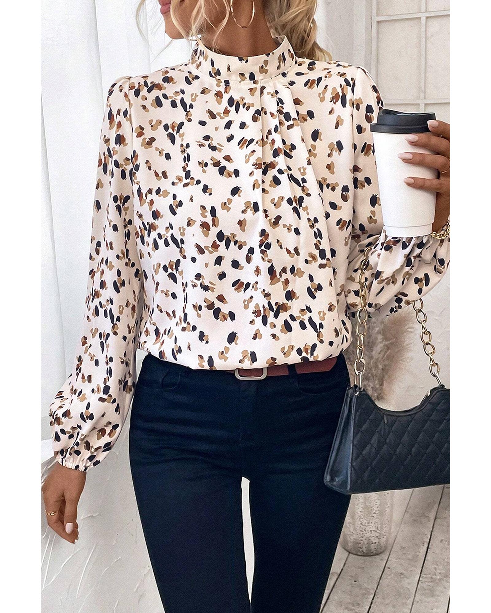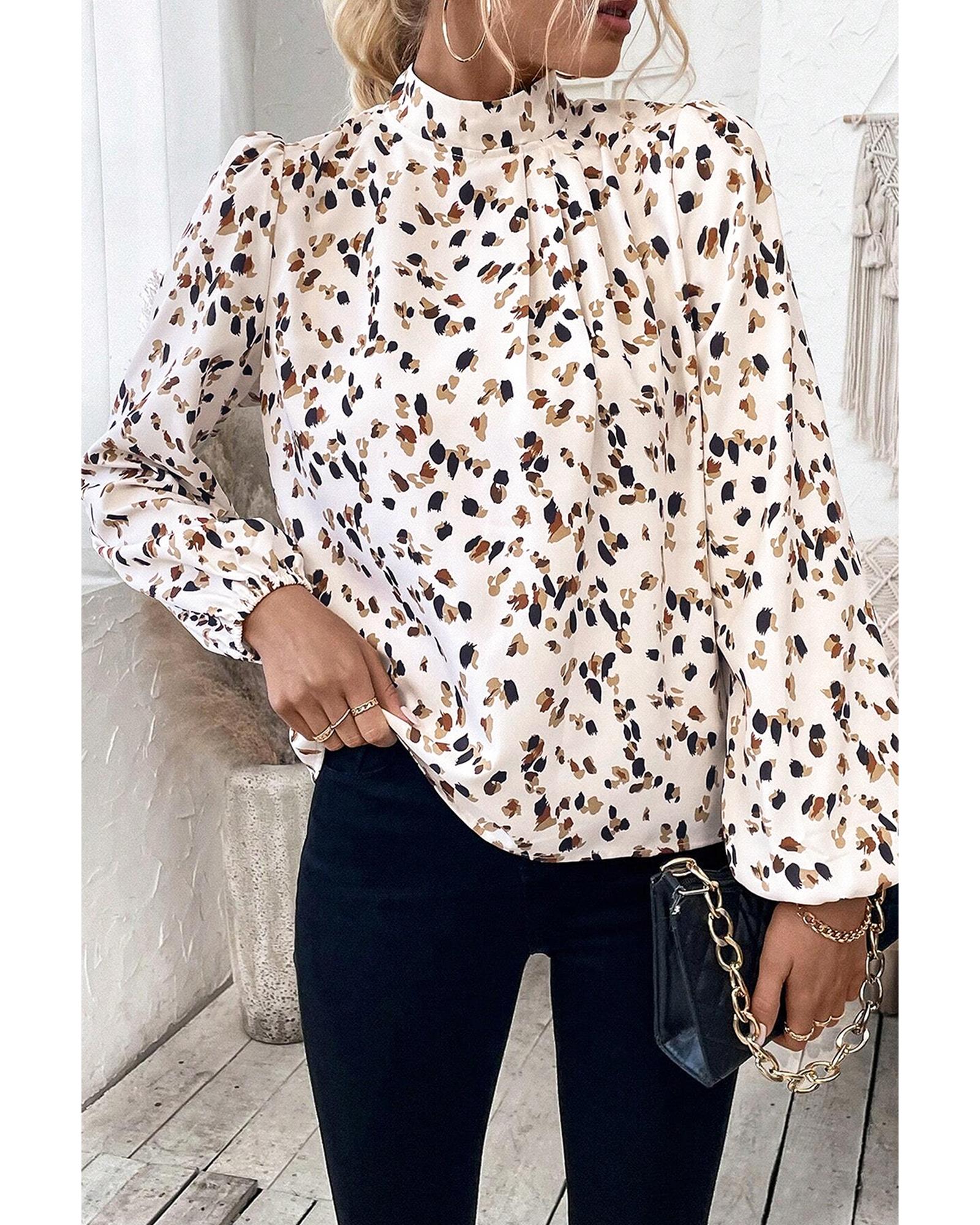 This stylish blouse features a trendy white leopard print design, complemented by lantern sleeves and a mock neck. The pleated detailing adds a touch of elegance, making it a versatile addition to your wardrobe.