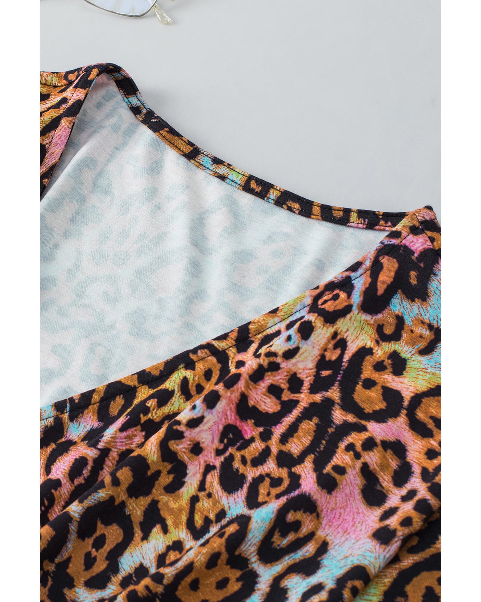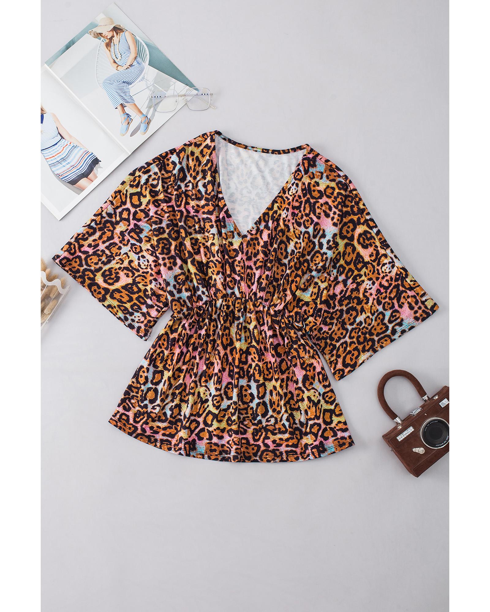 This stylish blouse features a white leopard print design with wide sleeves and a peplum hem, creating a trendy and fitted silhouette. The V-neckline adds a touch of elegance, while the cinched waist enhances the overall shape. Made with high elasticity material, it offers comfort and flexibility. Available in sizes S to XL, it is suitable for various body types.
