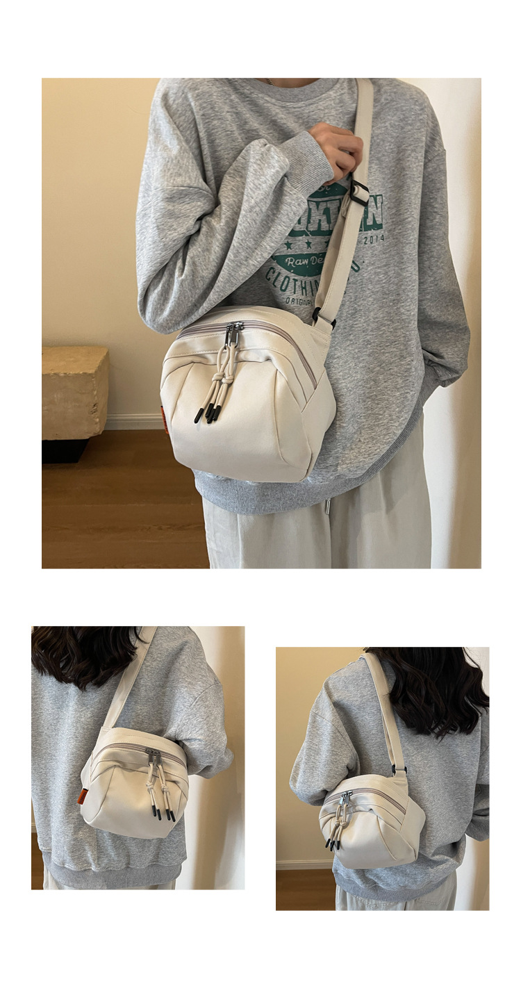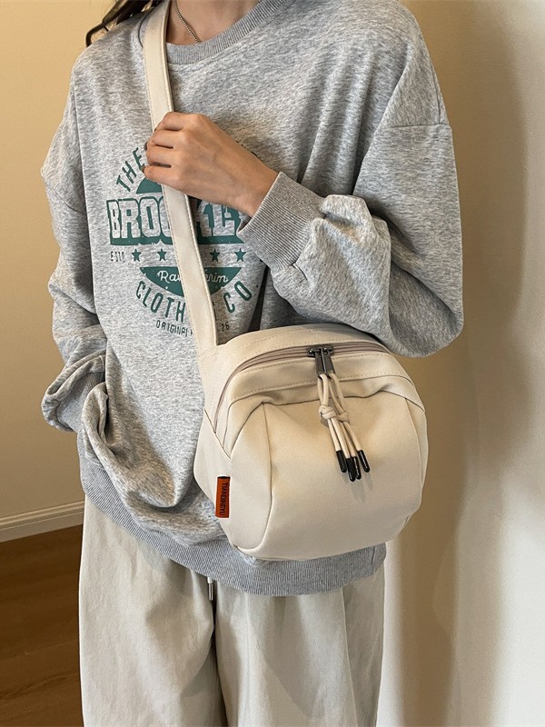 - Features: Made from durable high-density canvas with a soft polyester lining, this bag is lightweight and designed for daily wear. It features a clean, solid-color aesthetic with a shell shape that complements any casual outfit. The adjustable strap allows for a comfortable fit, and internal pockets help organize essentials. The bag is equipped with smooth-gliding zippers and stylish knotted cord pulls for easy access and a minimalist look.