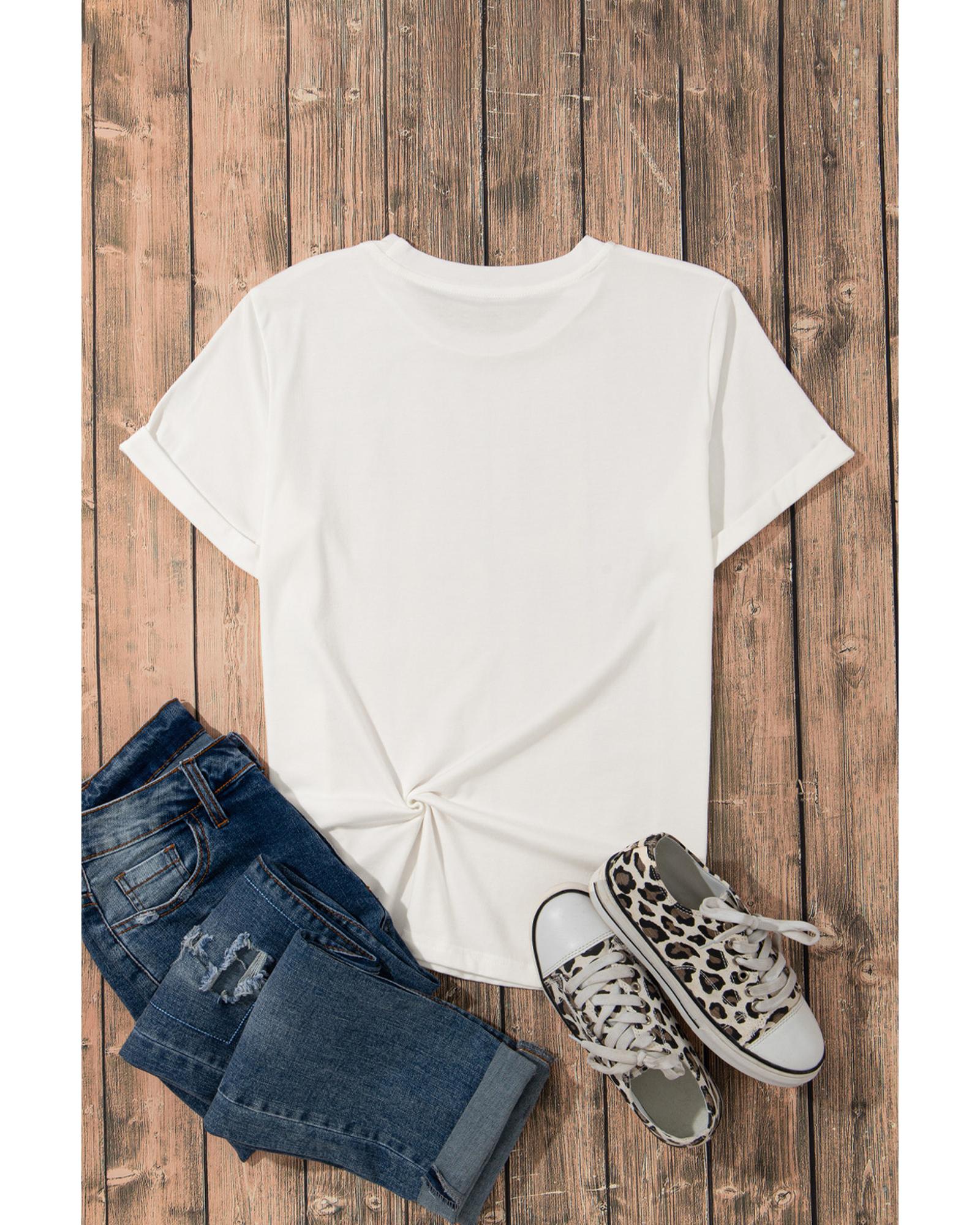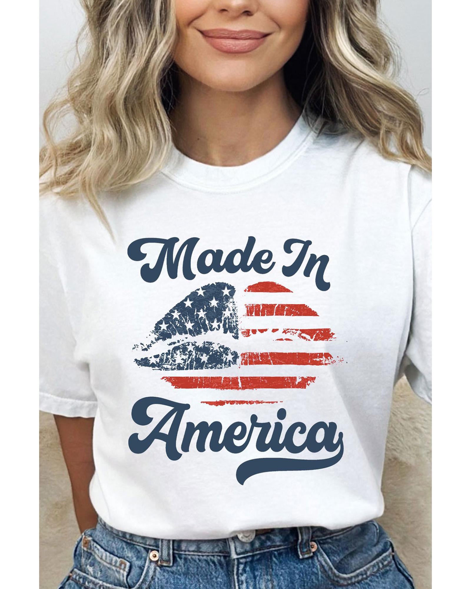 This white O neck T shirt features a stylish lip print design with an American flag motif, offering a trendy and casual look. Made from a comfortable blend of polyester, cotton, and elastane, it is suitable for pairing with jeans or denim shorts for everyday wear.