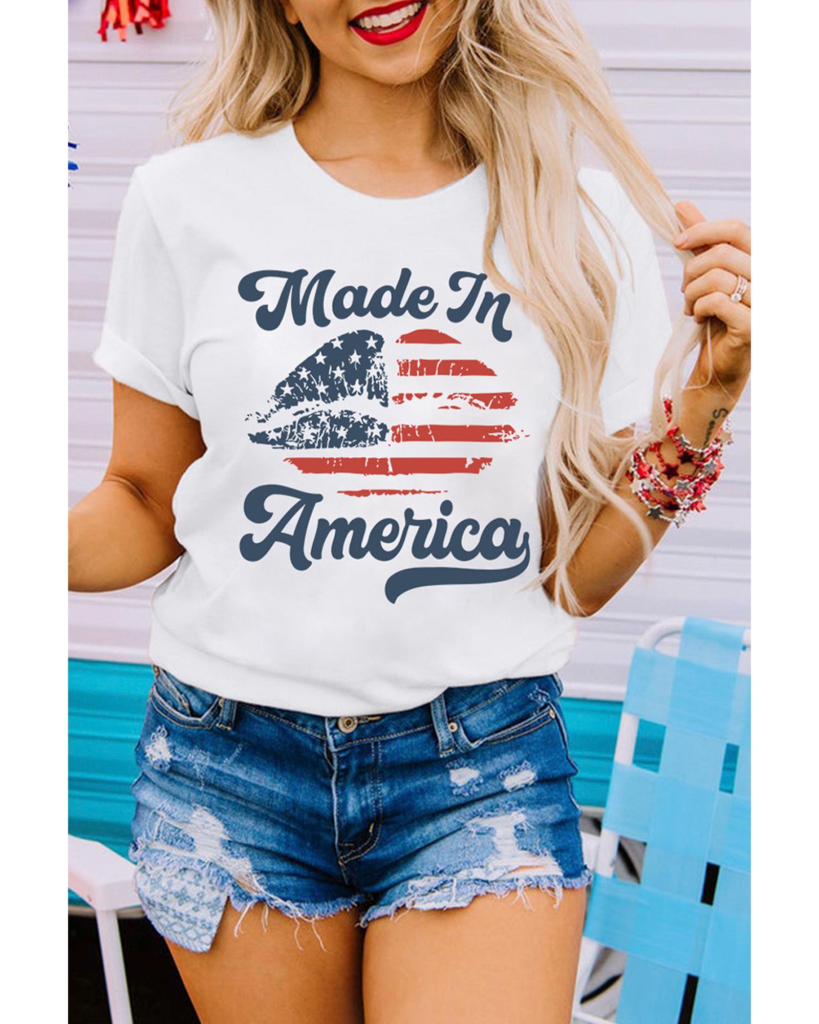 This white O neck T shirt features a stylish lip print design with an American flag motif, offering a trendy and fitted look. Made from a high-quality fabric blend, it is easy to pair with jeans or denim shorts for a casual yet fashionable appearance.