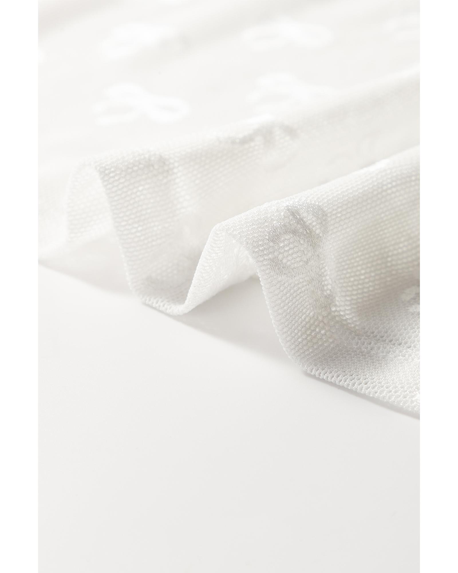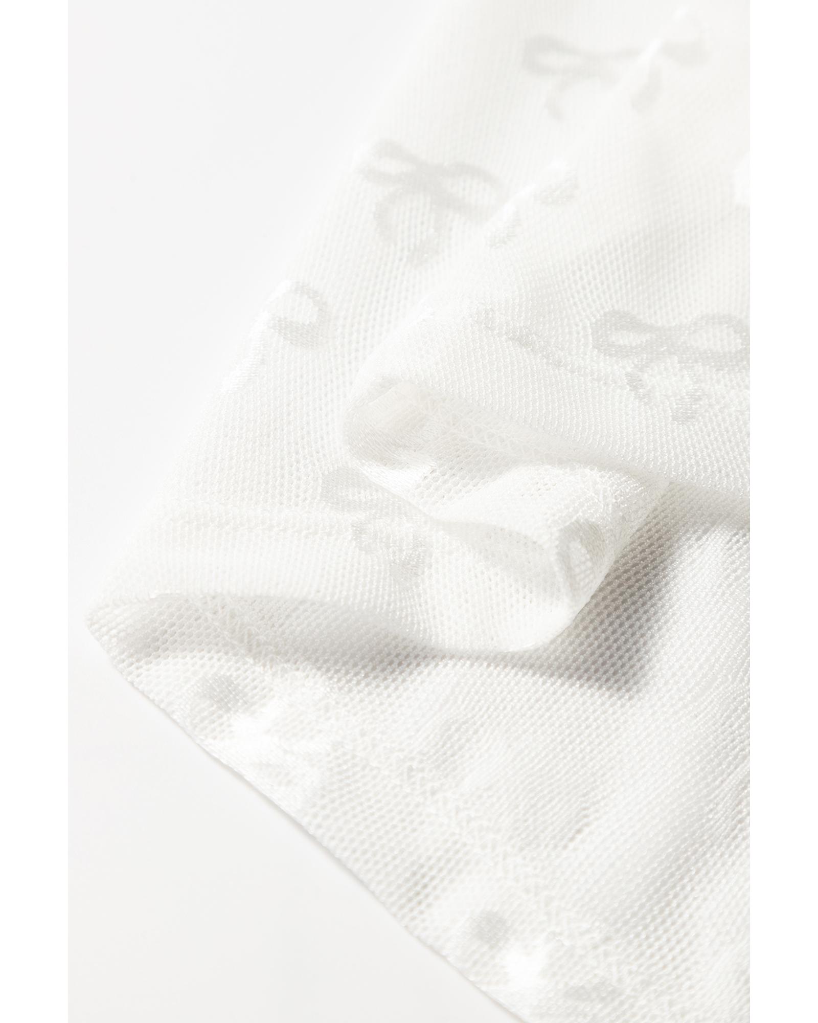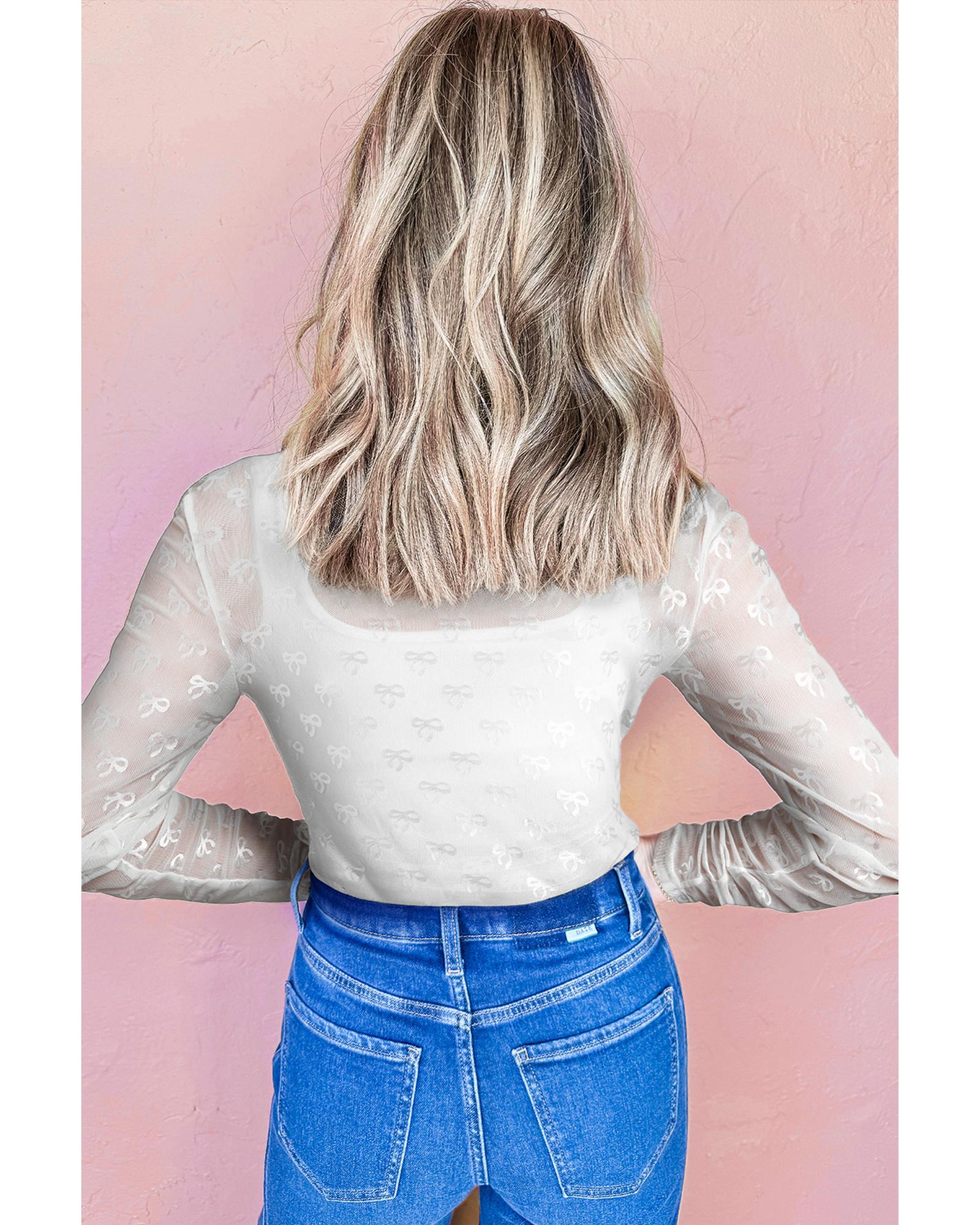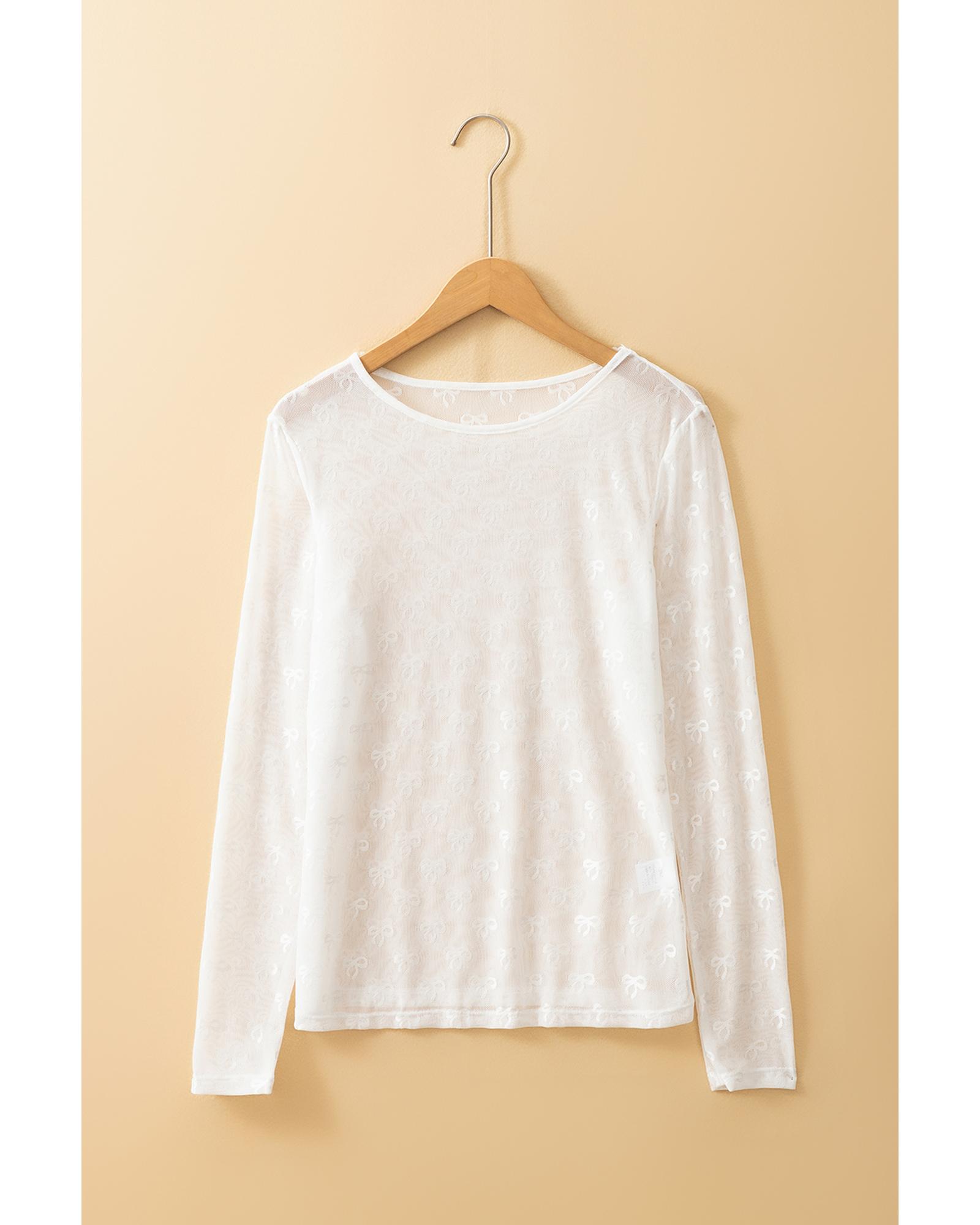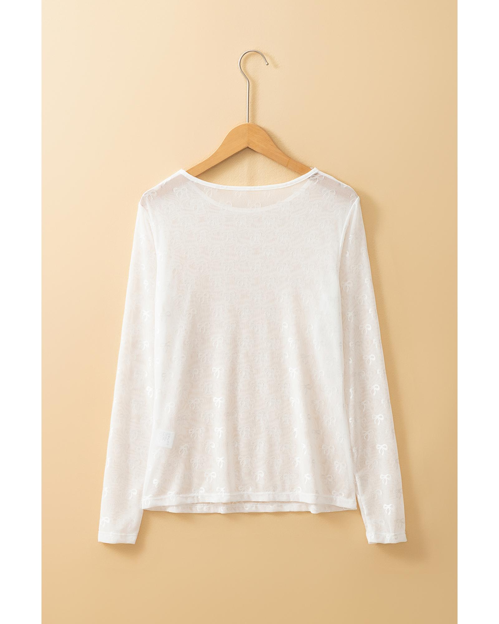 White Mesh Bow Pattern Long Sleeve Top – L