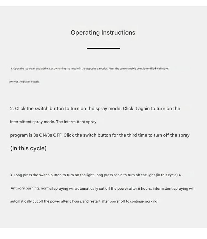 - Offers two mist modes: continuous and intermittent, with different runtime durations