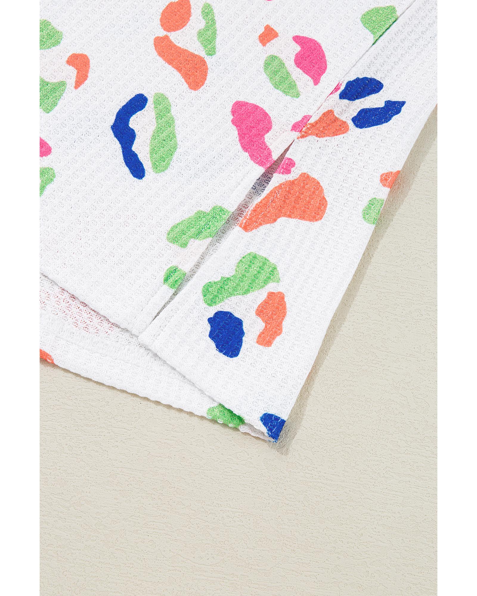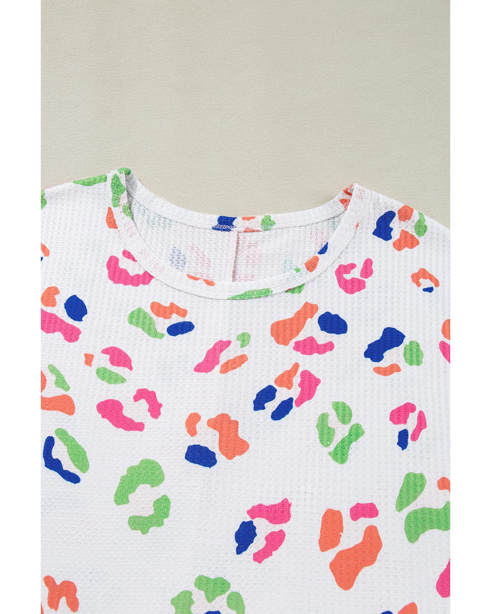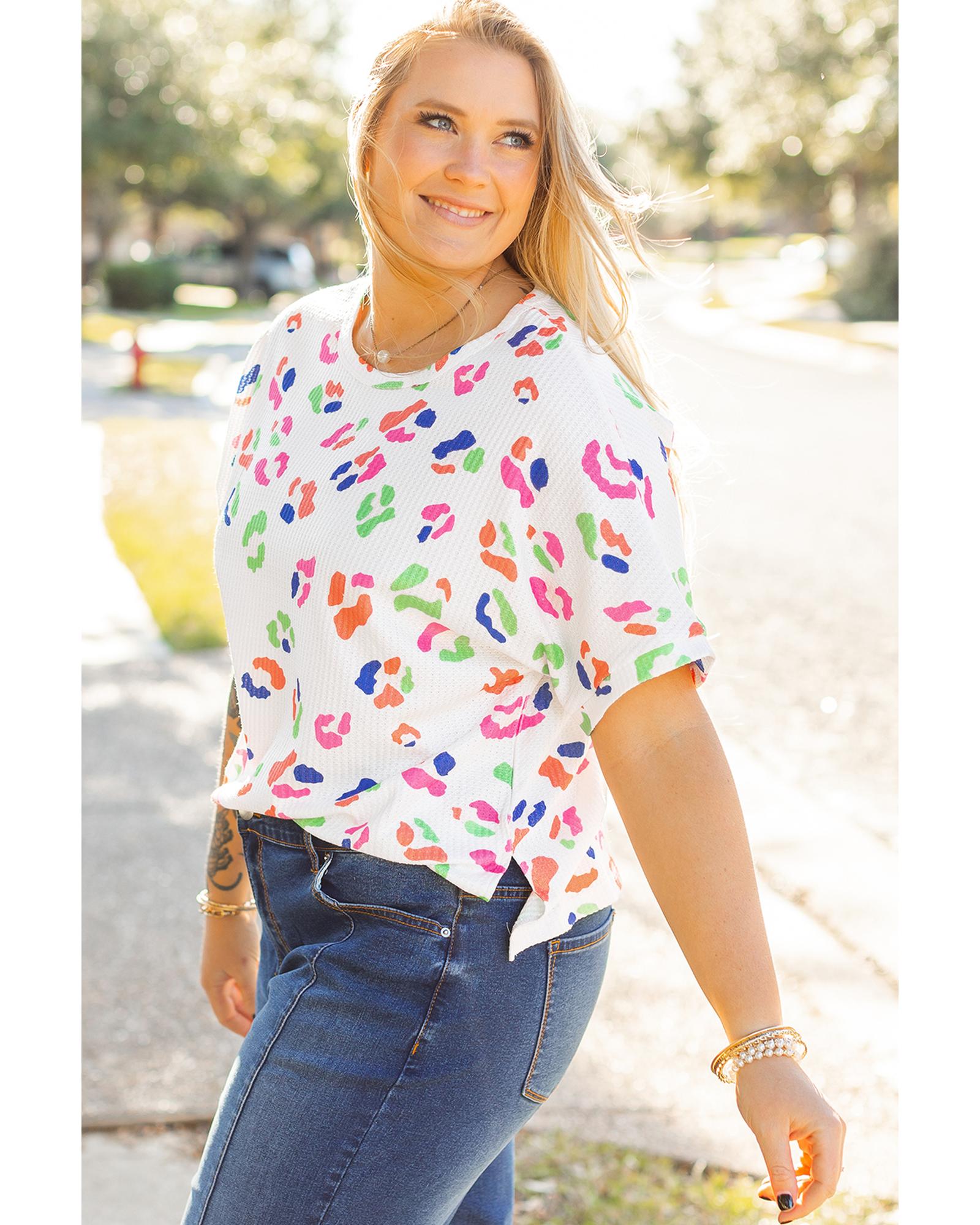 This plus size T-shirt features a vibrant multicolor leopard print and a textured design, offering a trendy and eye-catching look. Made from lightweight waffle material, it provides softness and comfort for everyday wear. The classic round neck and short sleeves make it versatile and suitable for casual occasions. The casual fit is complemented by side slits, adding a touch of style. It pairs well with denim shorts or jeans for a fashionable outfit.