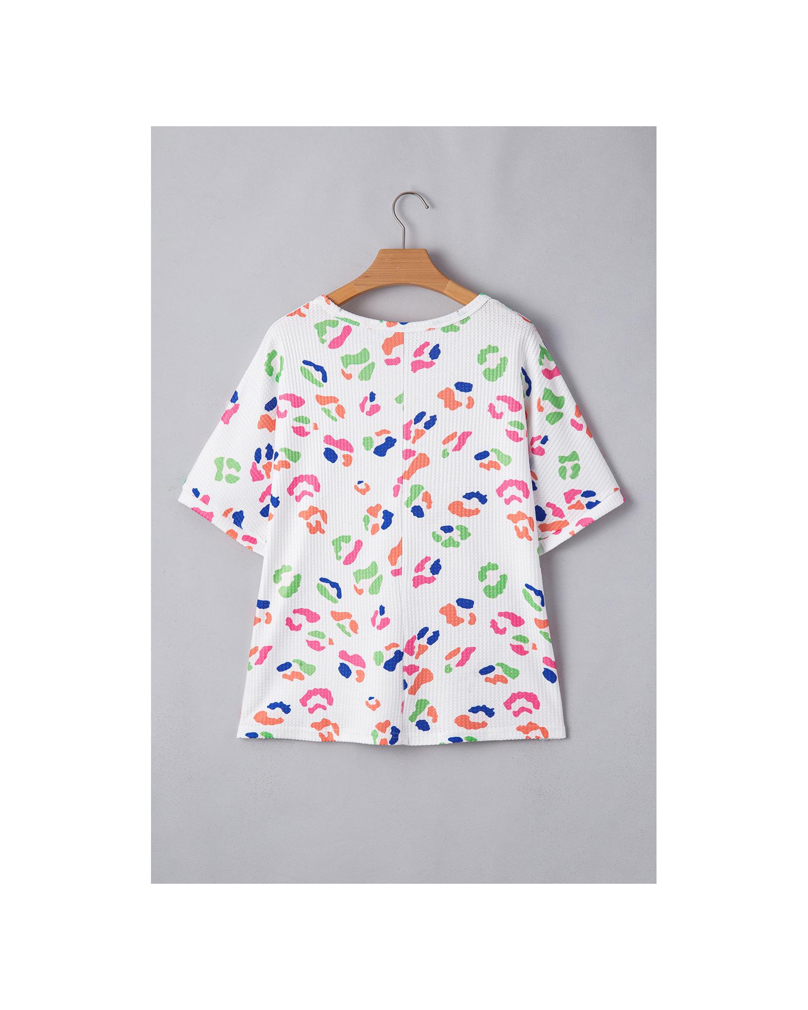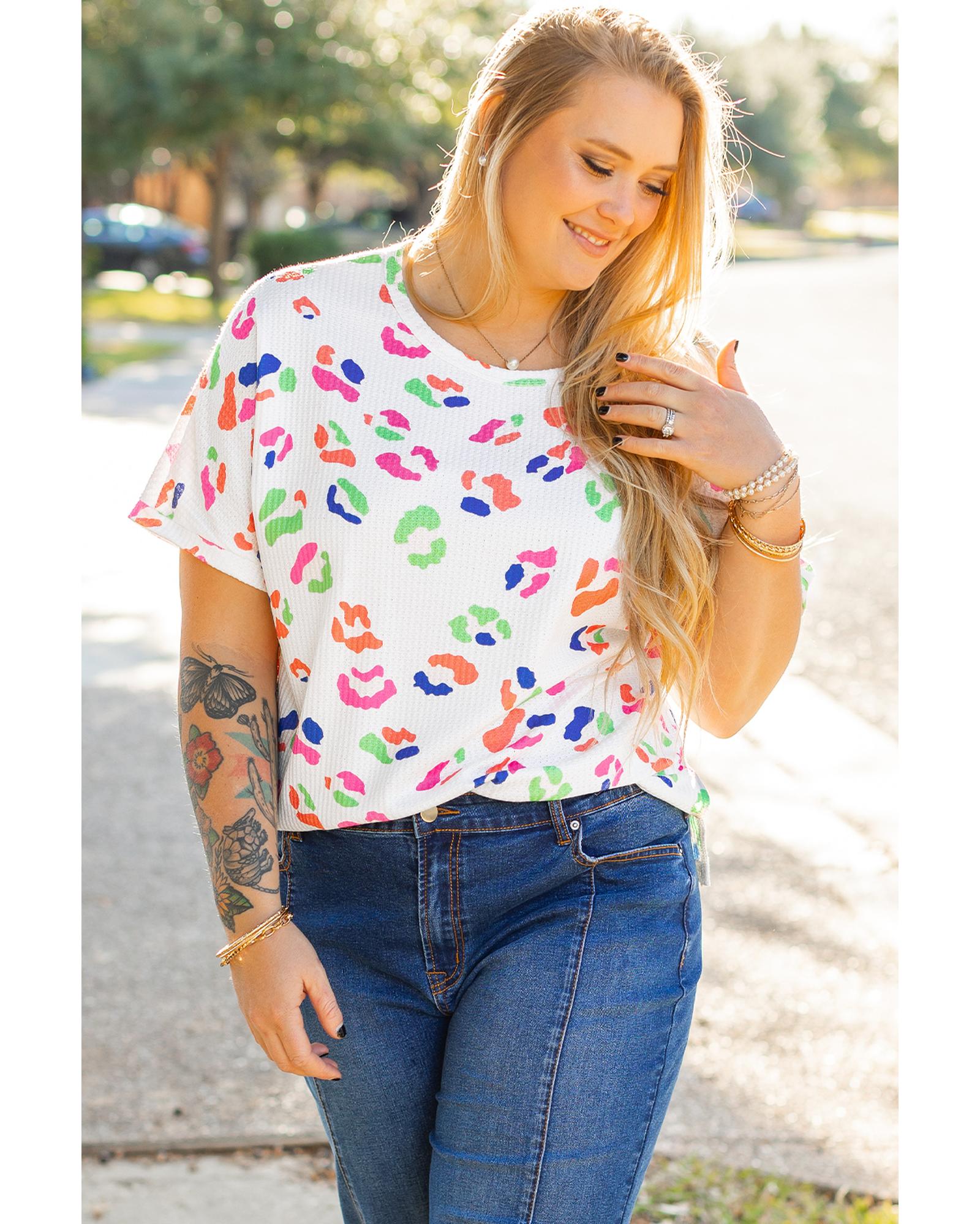 This plus size T-shirt features a vibrant multicolor leopard print and a textured design, offering a trendy and eye-catching look. Made from lightweight waffle material, it provides softness and comfort for everyday wear. The classic round neck and short sleeves make it versatile and suitable for casual occasions.