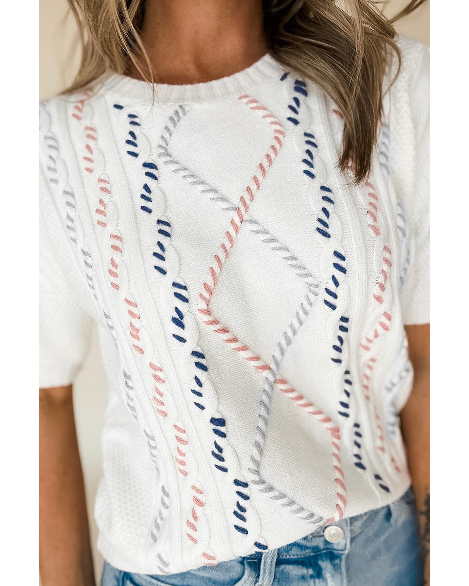 White Multicolor Stitch Detail Cable Knit Short Sleeve Sweater – L