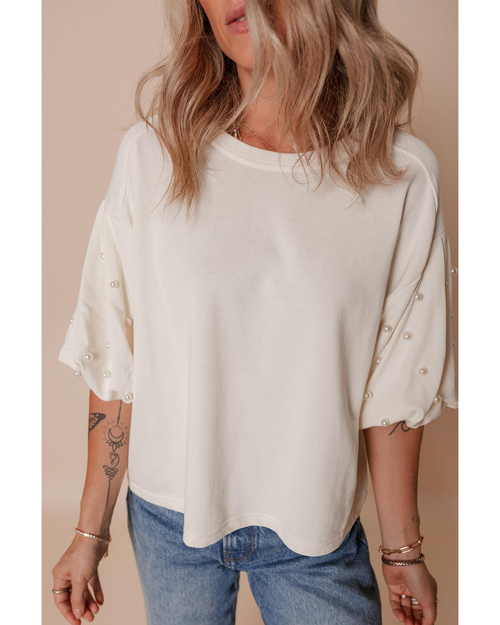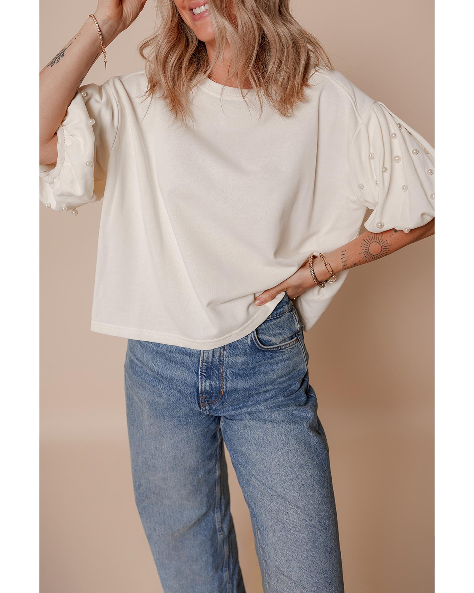 This white puff sleeve top features a round neckline and a loose fit, offering a stylish and comfortable look. The design includes luxurious pearled decoration on the sleeves and puff half sleeves that create a graceful silhouette. It is suitable for various styling options and provides medium elasticity for ease of movement.
