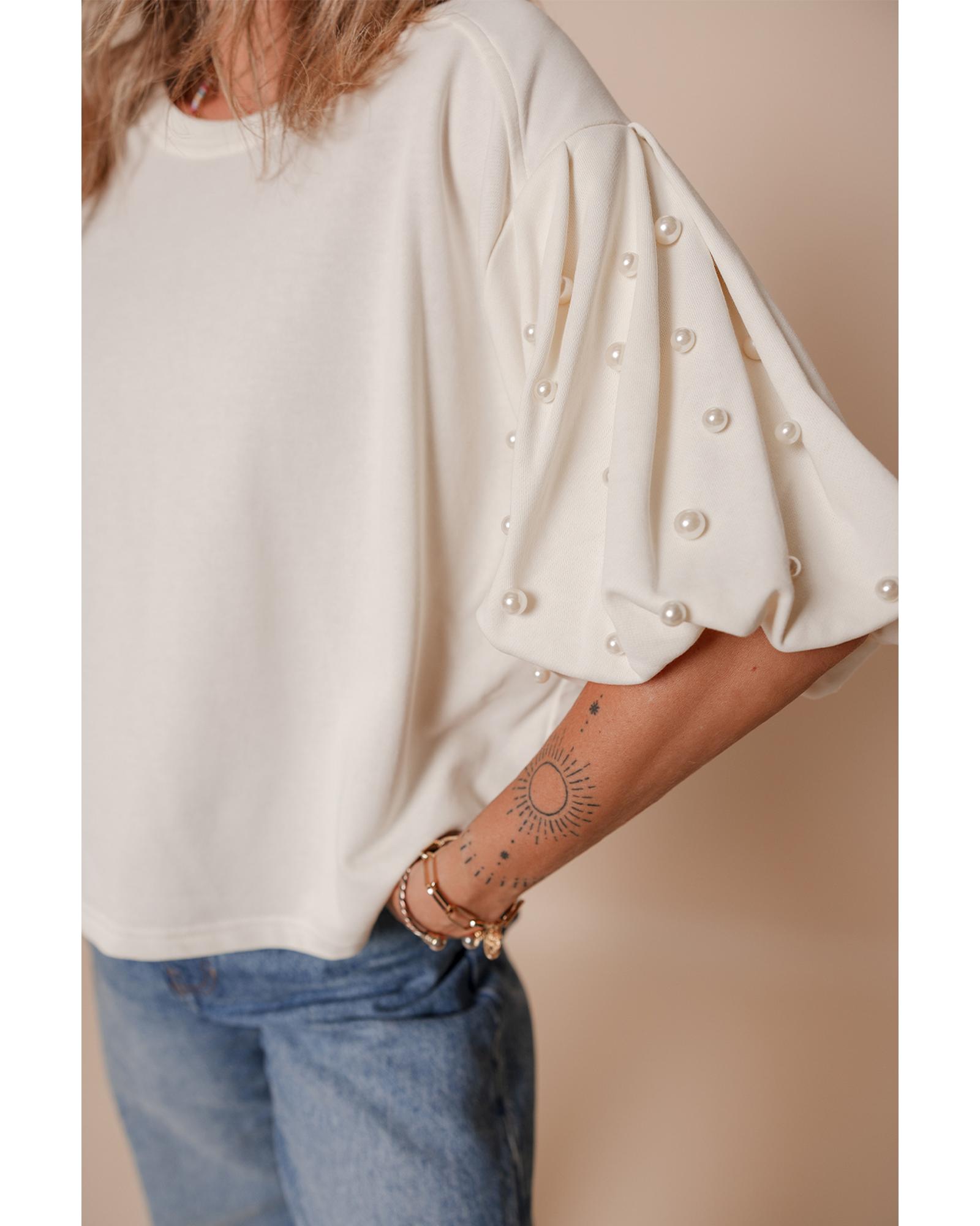 White Pearled Puff Sleeve Round Neck Loose Top – M