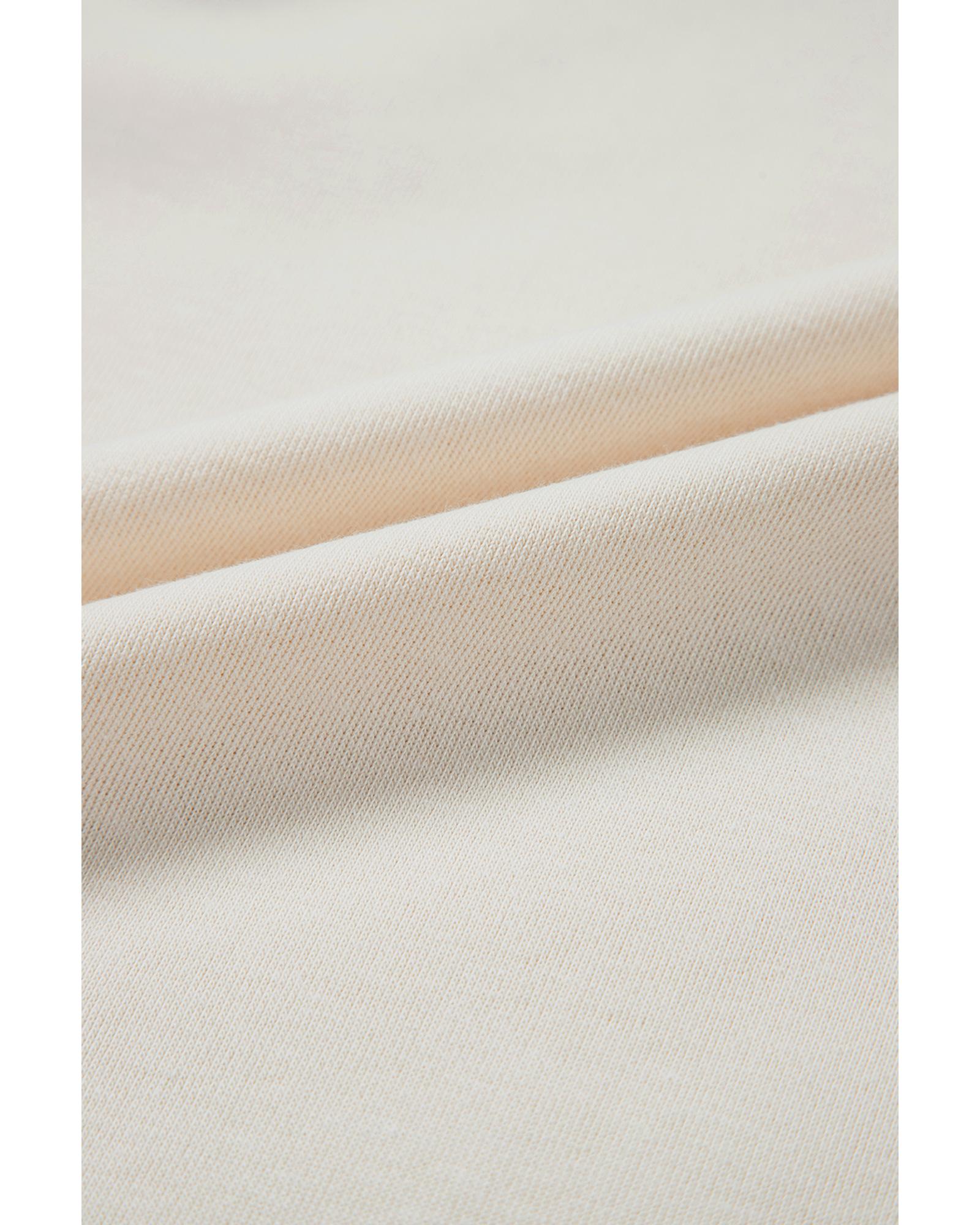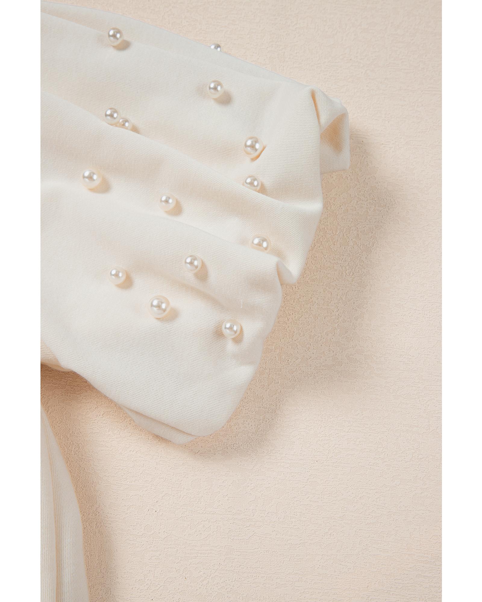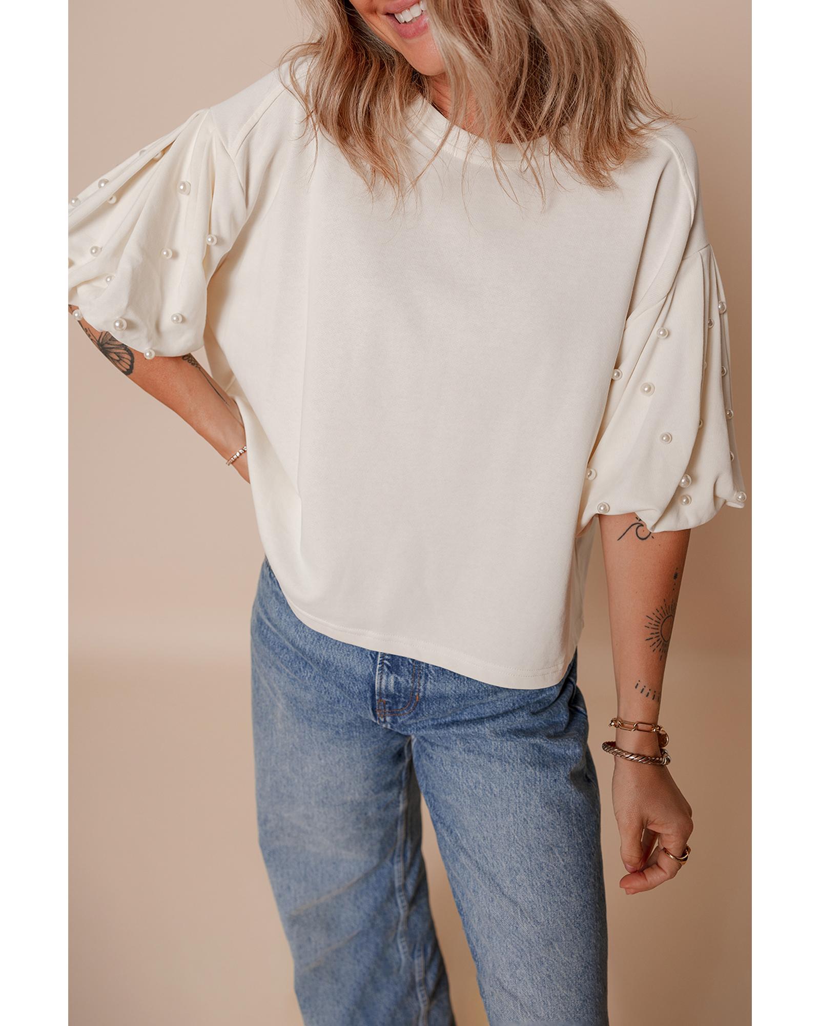 This white puff sleeve top features a round neckline and a loose fit, offering a stylish and versatile look suitable for various occasions. The design includes luxurious pearled decoration on the sleeves and puff half sleeves that create a graceful silhouette. Crafted with medium elasticity, it provides comfort and a trendy fitted appearance.