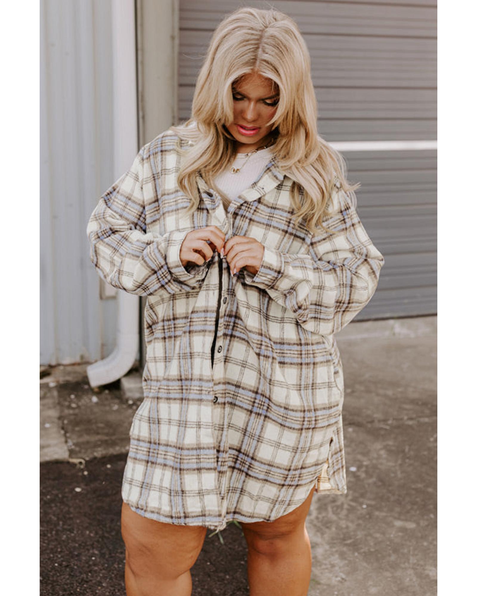 This white plaid print tunic shacket is a stylish and versatile piece designed for plus size wearers. It features a relaxed fit and tunic length, providing ample coverage and comfort. The classic plaid pattern adds a timeless touch, making it suitable for various occasions. The design includes modern side slits for ease of movement and a fashionable layered look.