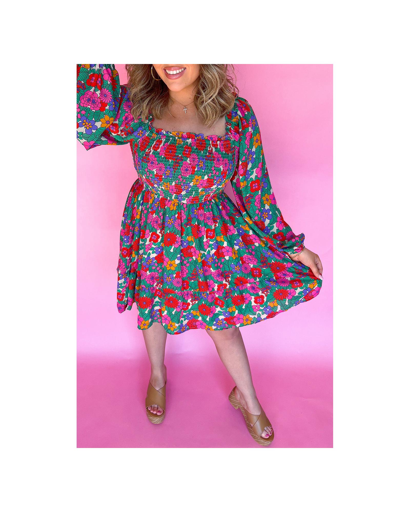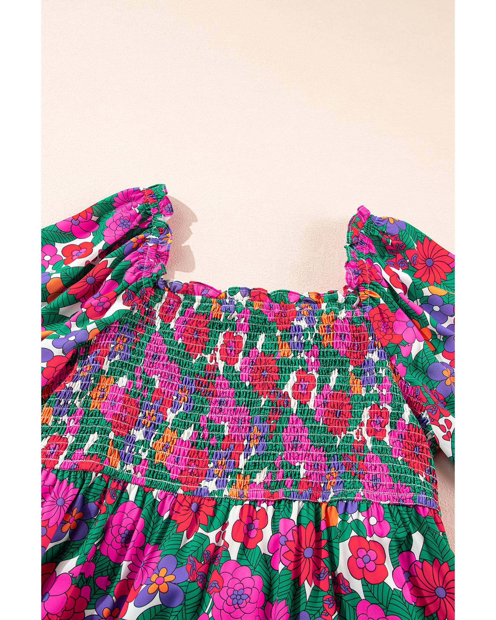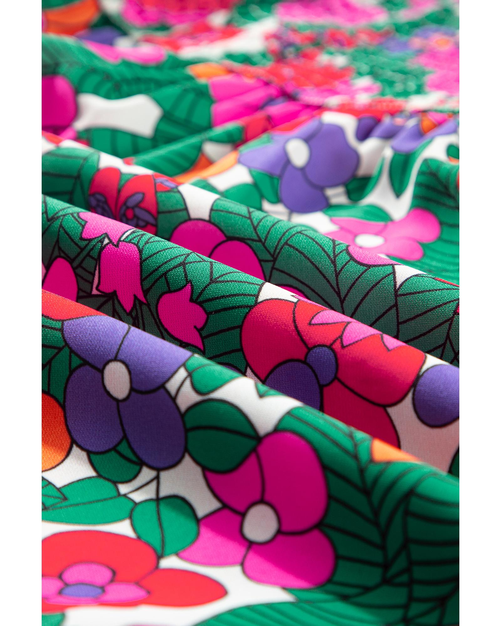 - Vibrant floral print with a frilled square neckline