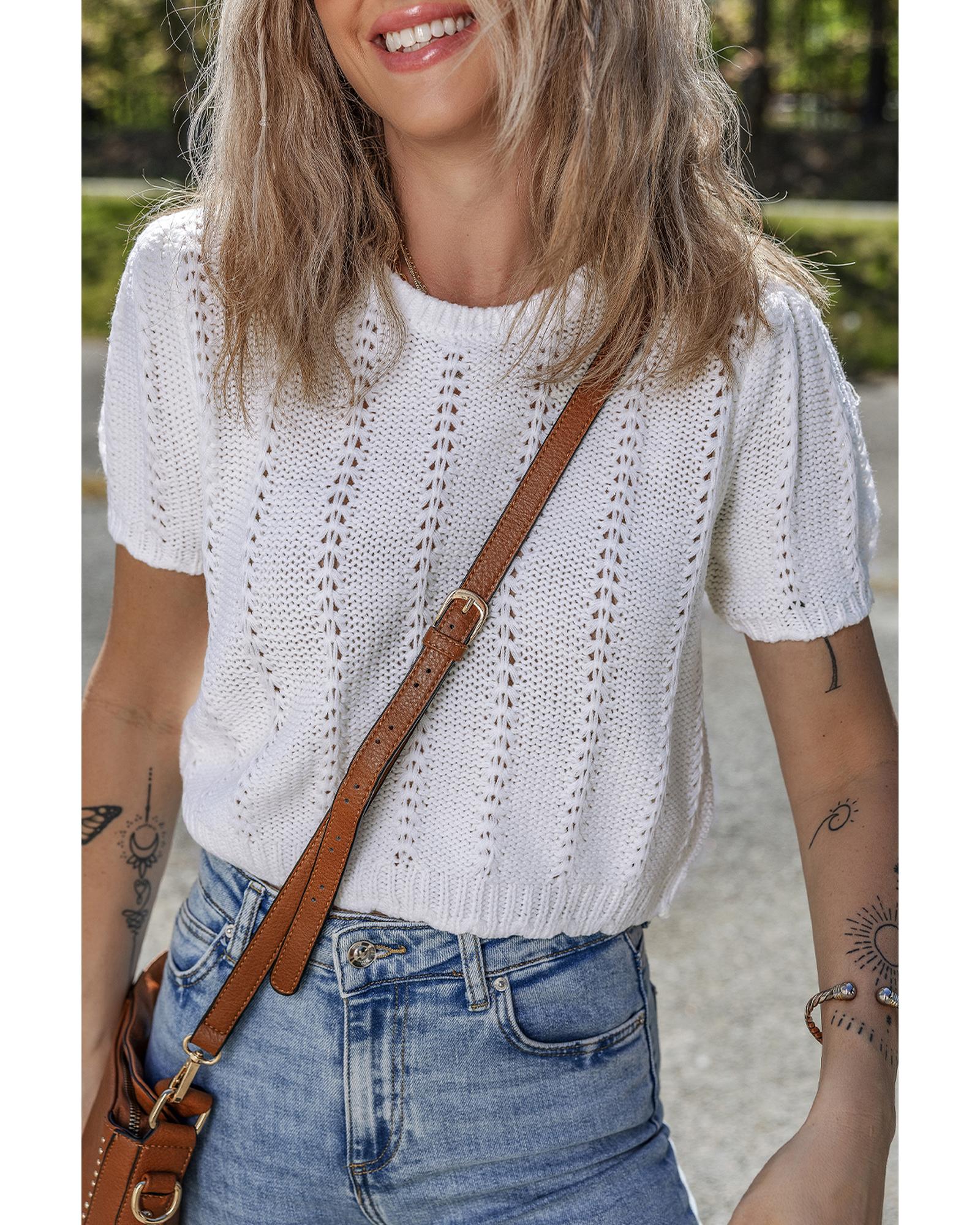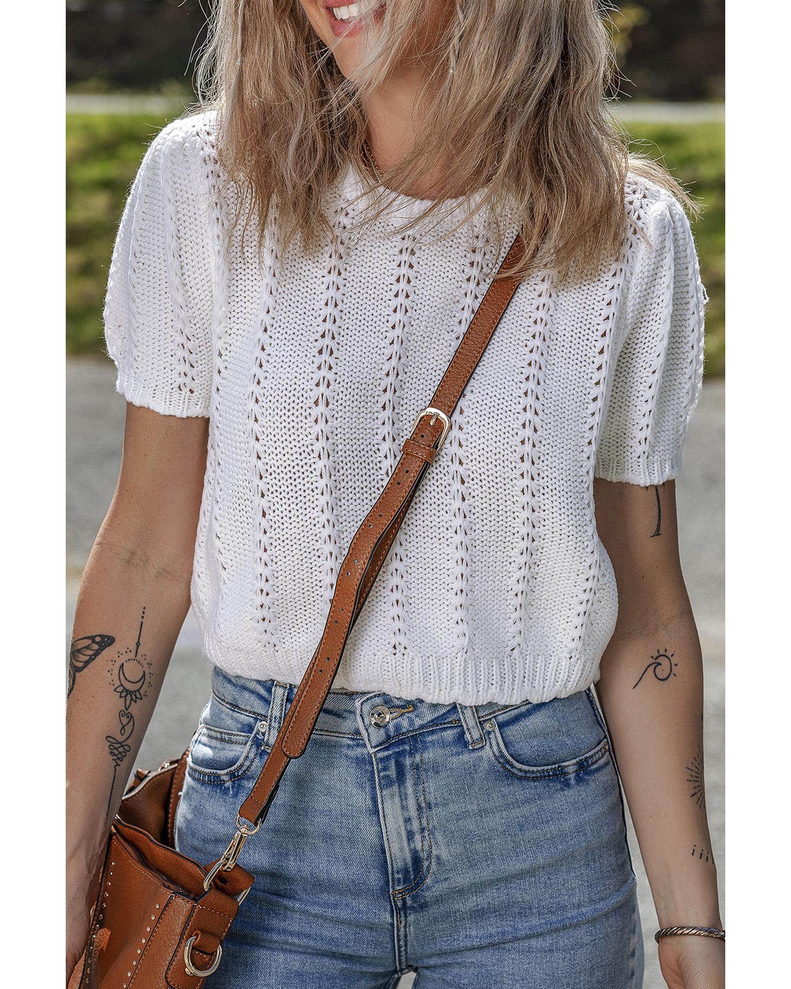 - 1 x White Pointelle Knit Short Puff Sleeve Crewneck Sweater