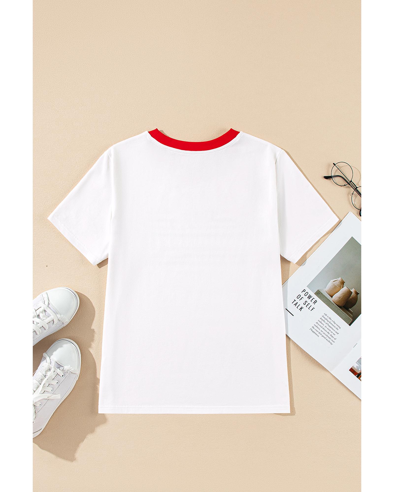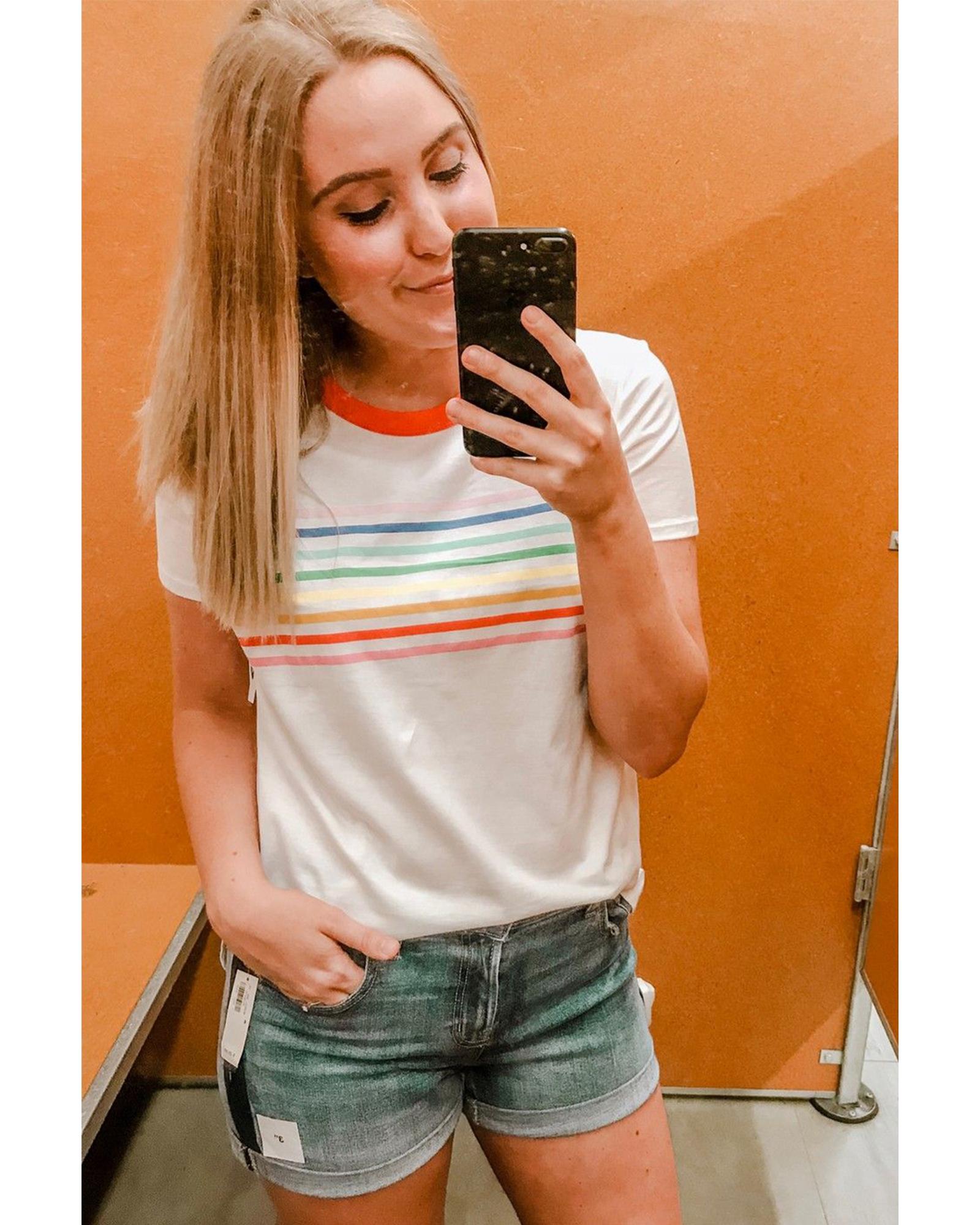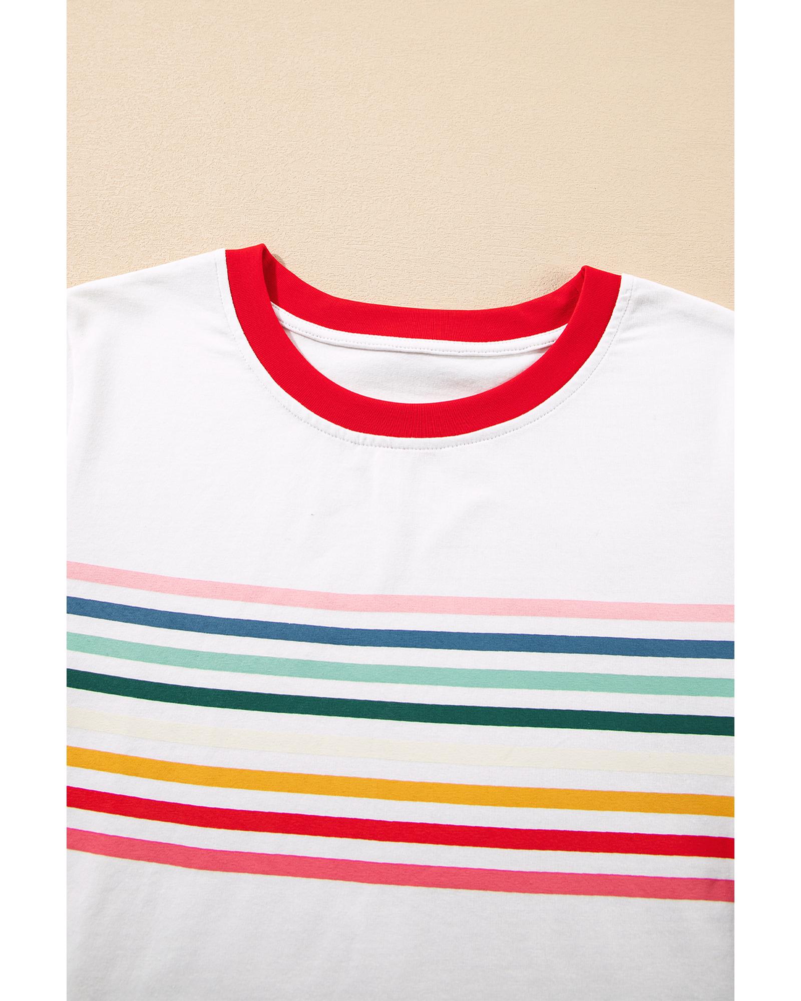 This T-shirt features a vibrant rainbow stripe print on the front, adding a chic and colorful touch to your casual wardrobe. The contrast neckline creates a stylish colorblock effect, while the comfortable crewneck design offers a classic look. Made from soft and breathable fabric, it is suitable for everyday wear.