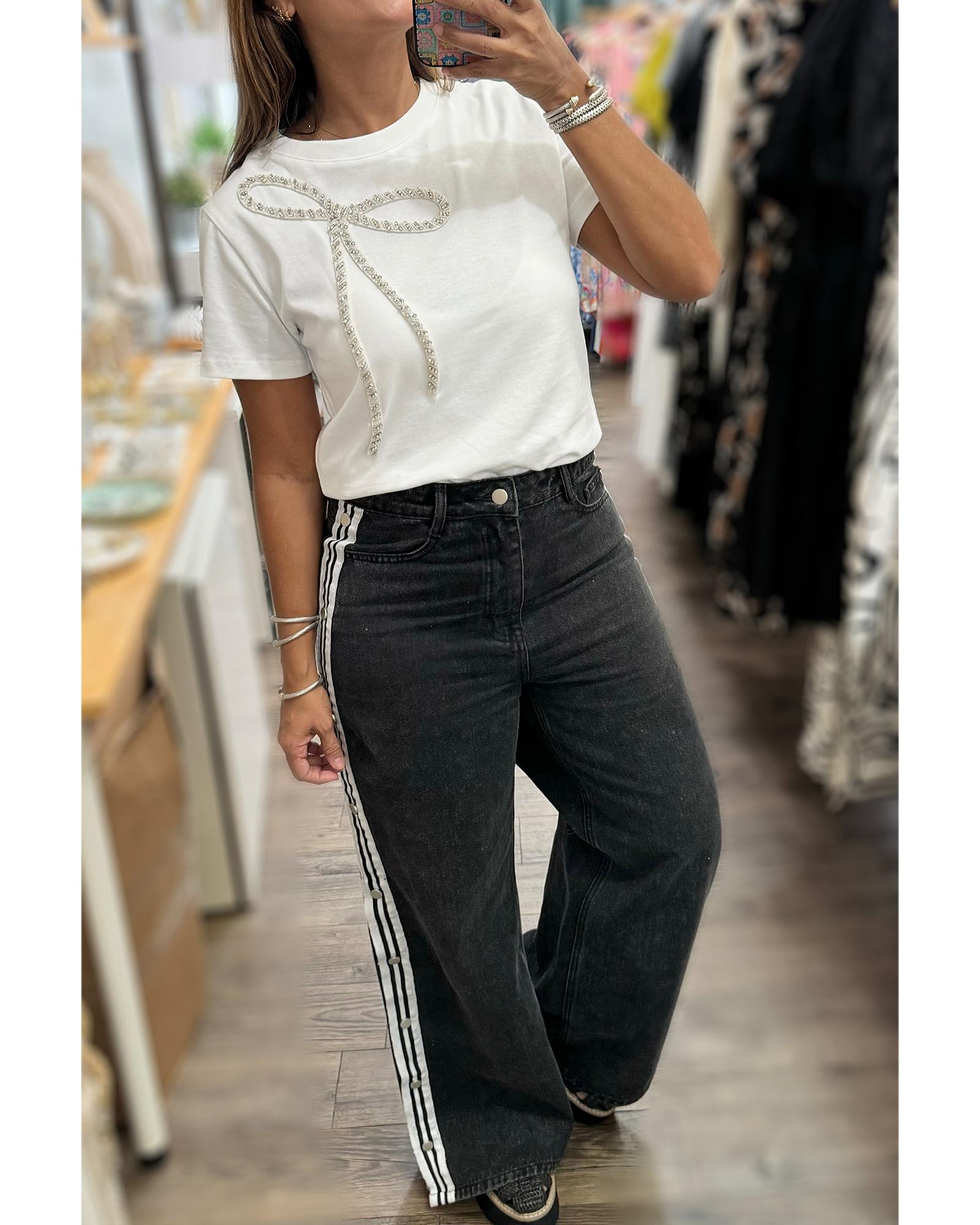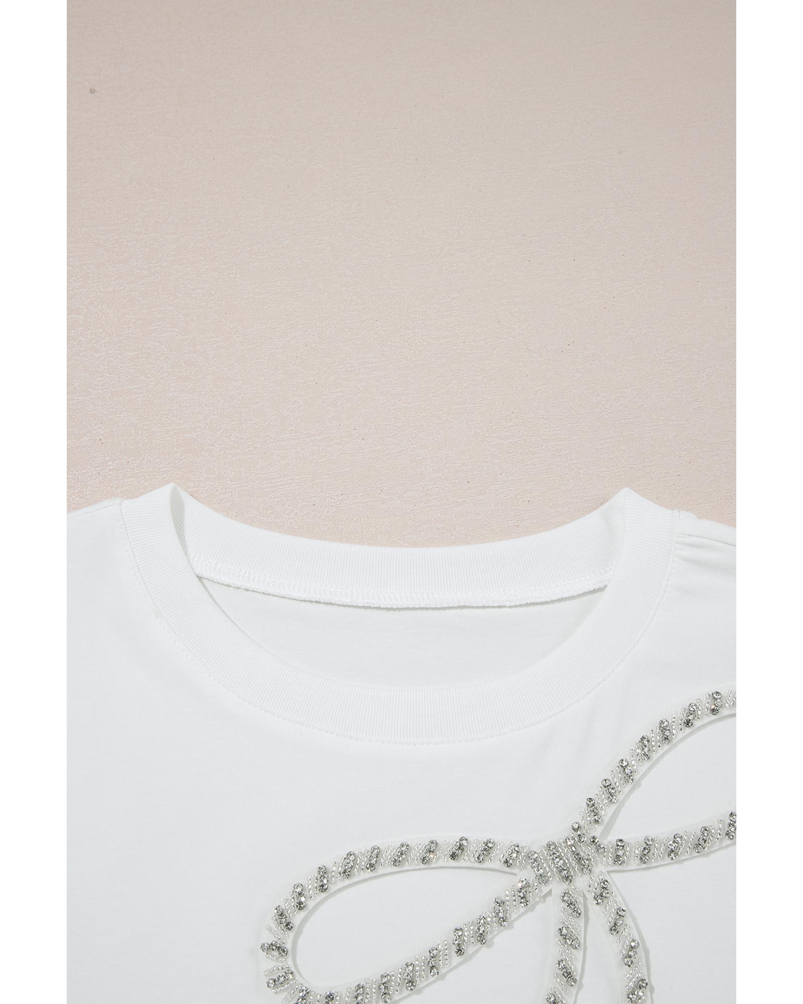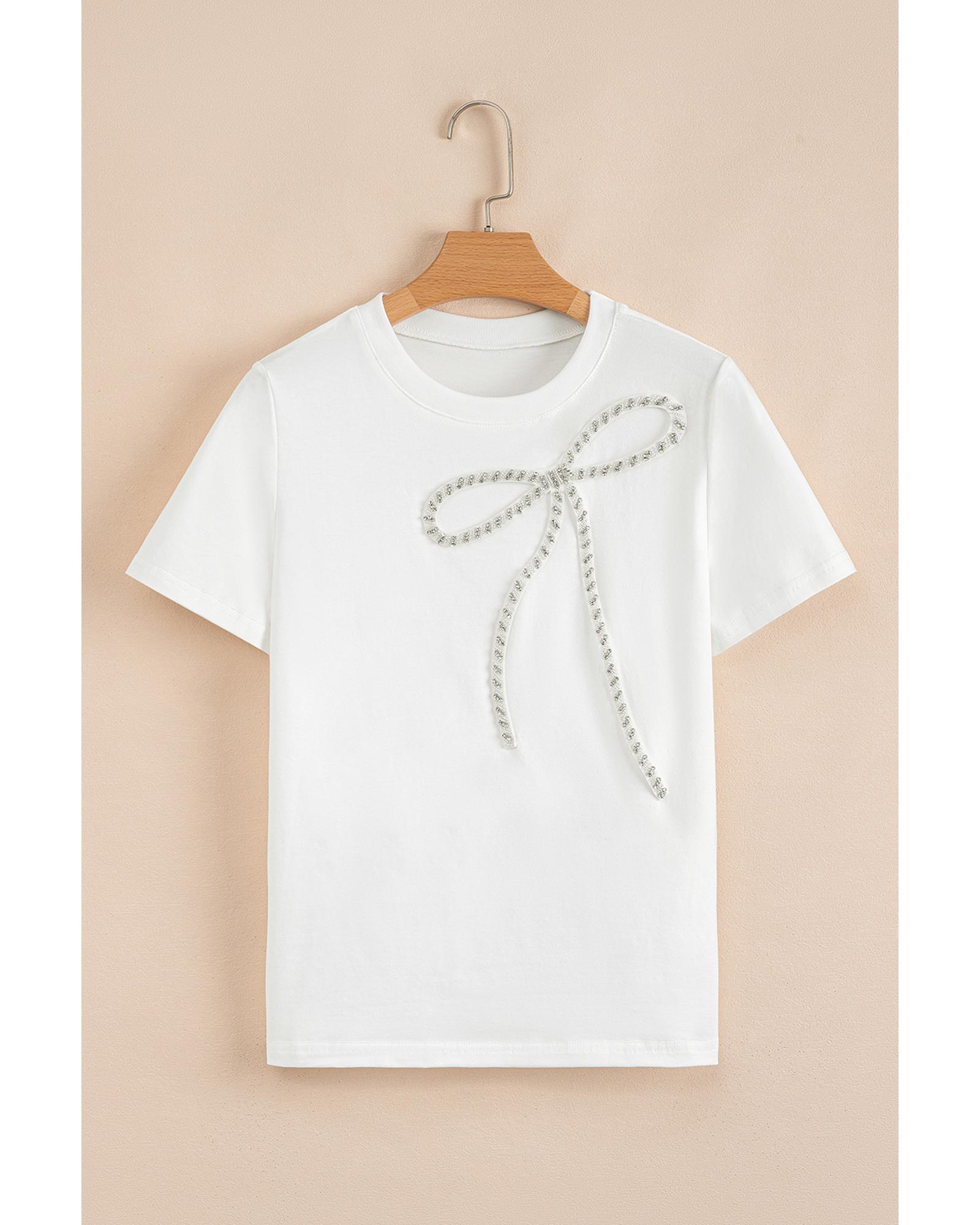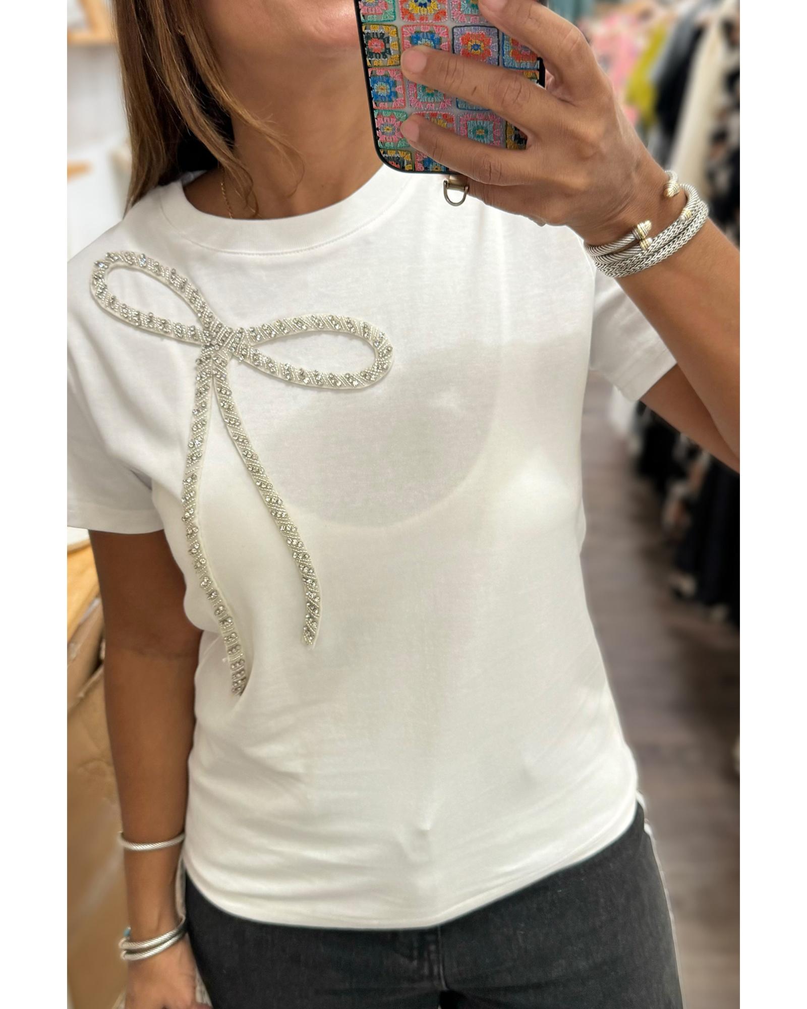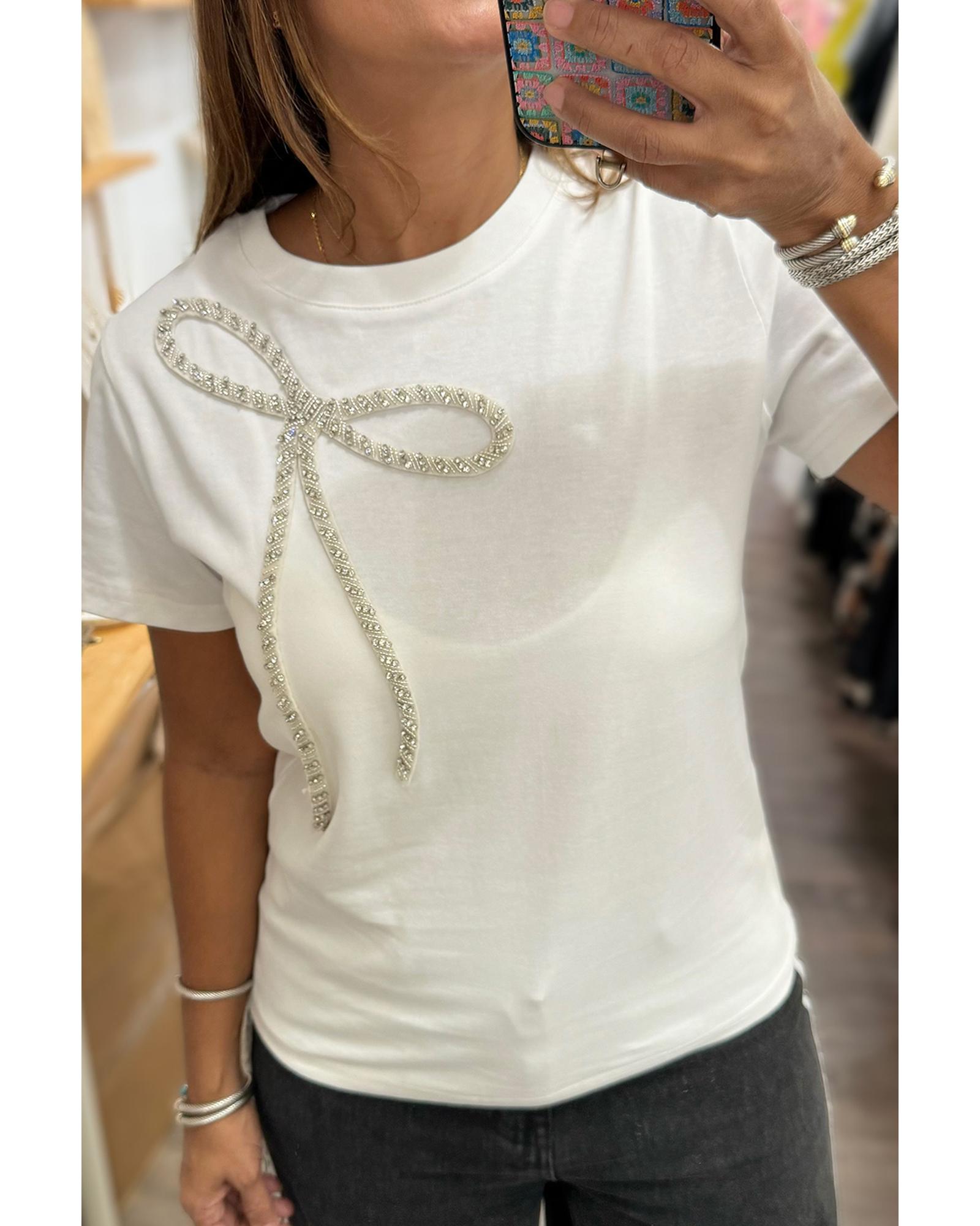 White Rhinestone Bow Embellished Round Neck Tee – S