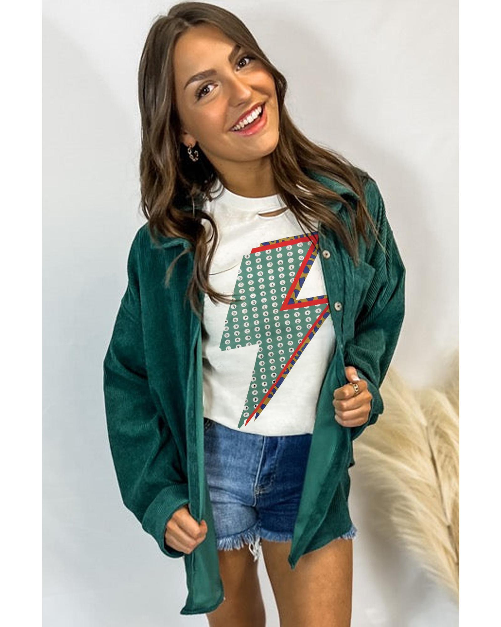 This stylish Western tee features a bold bolt graphic and rhinestone embellishments, combined with distressed detailing for a trendy, edgy look. Made from soft and breathable cotton fabric, it offers comfort and versatility, perfect for pairing with jeans or denim shorts for a casual yet fashionable outfit.