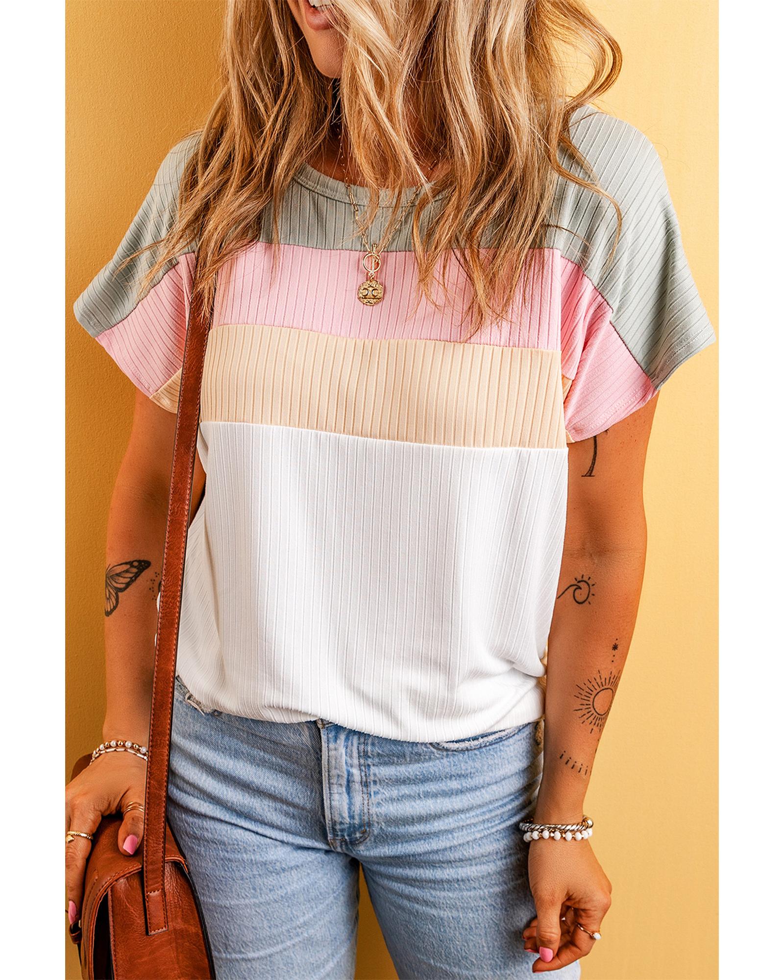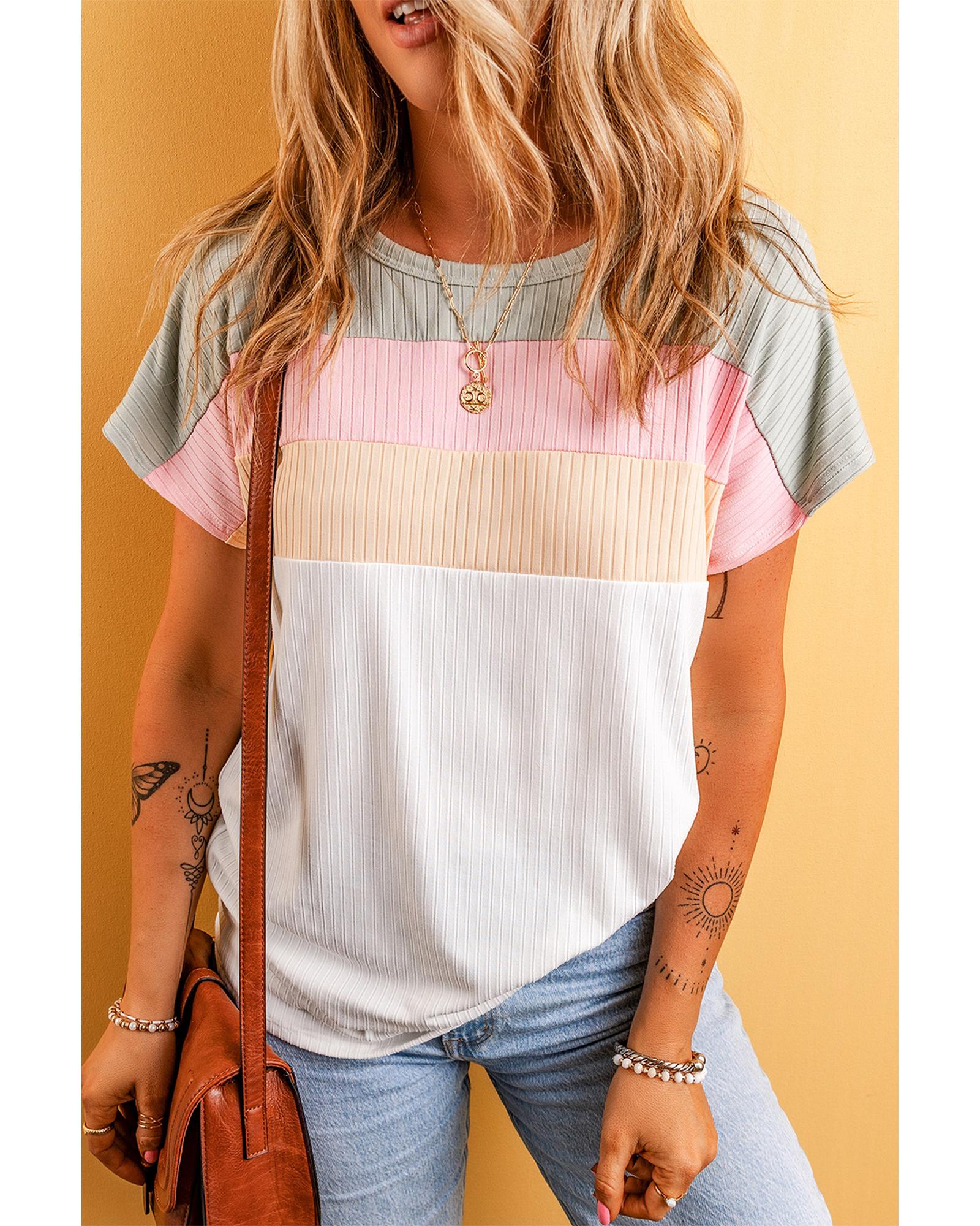 This White Ribbed Color Block Patchwork T-shirt offers a trendy fitted style with a comfortable fit. Designed with a ribbed texture and a colorblock pattern, it combines fashion and comfort effortlessly. Made from soft, high-quality fabric, it is suitable for various casual occasions and available in multiple sizes to ensure a perfect fit.
