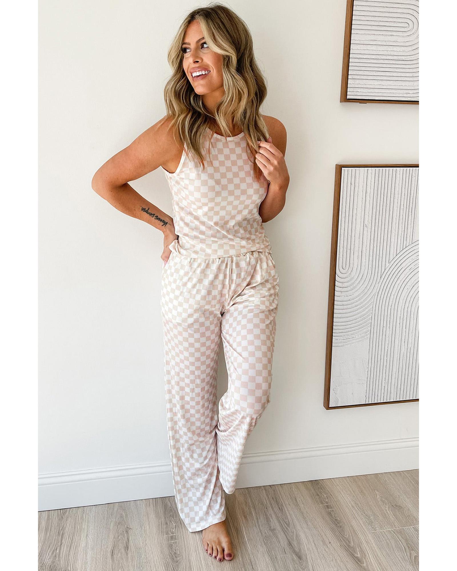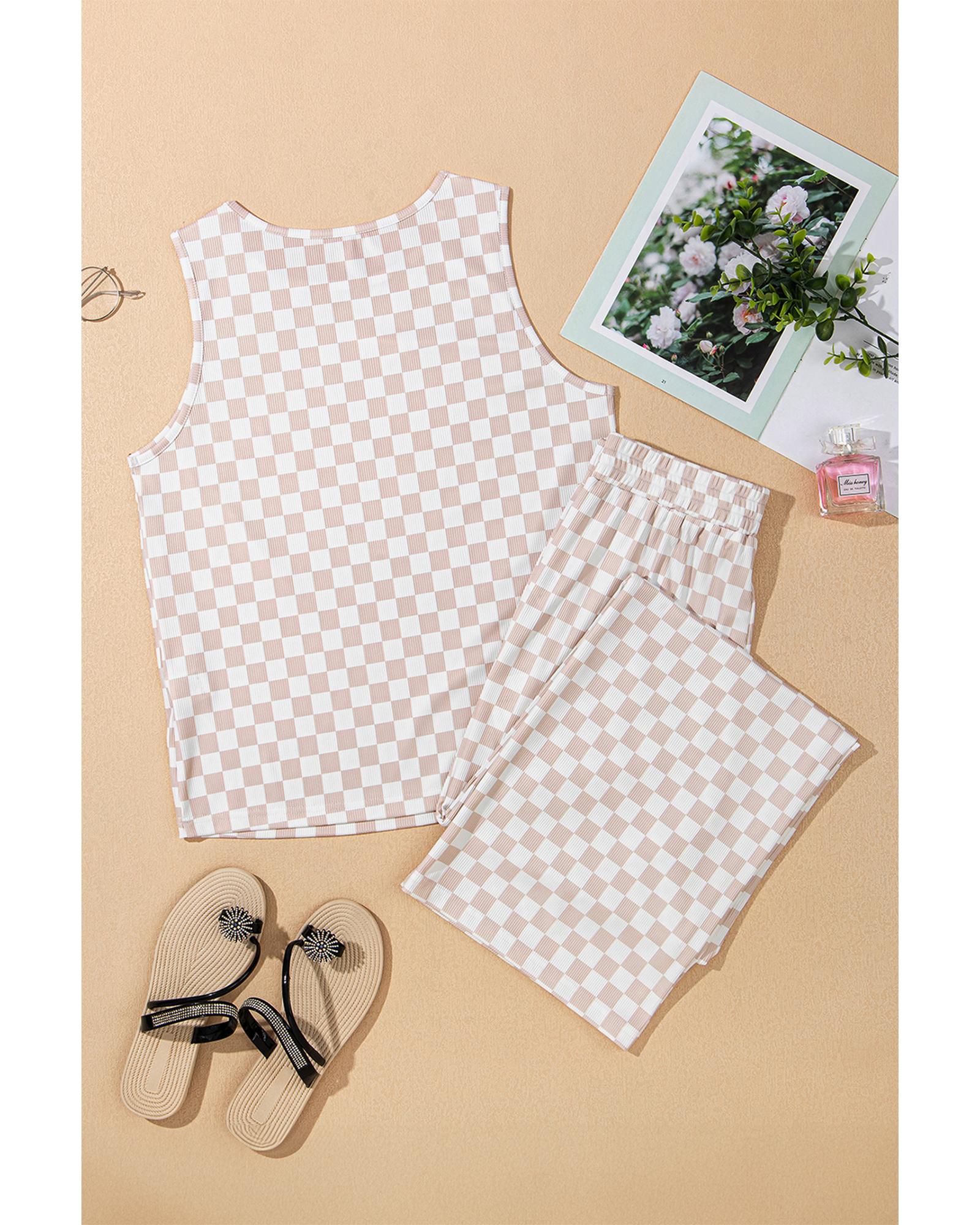 This two-piece set features a stylish checkered print with a textured ribbed fabric, combining comfort and fashion. It includes a tank top and high-waisted pants, designed to create a flattering silhouette with a slim fit. The set offers high elasticity for ease of movement and all-day comfort.