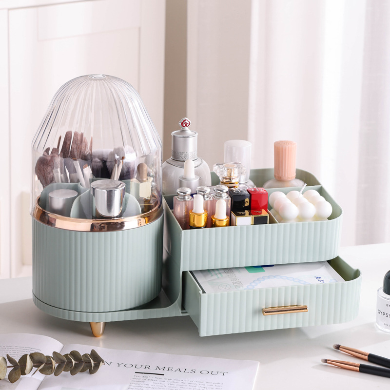This rotating makeup organizer box offers a stylish and functional solution for storing cosmetics and accessories. It features multiple compartments and a dustproof cover to keep your items organized, clean, and easily accessible, making it an ideal addition to your vanity or bathroom counter.