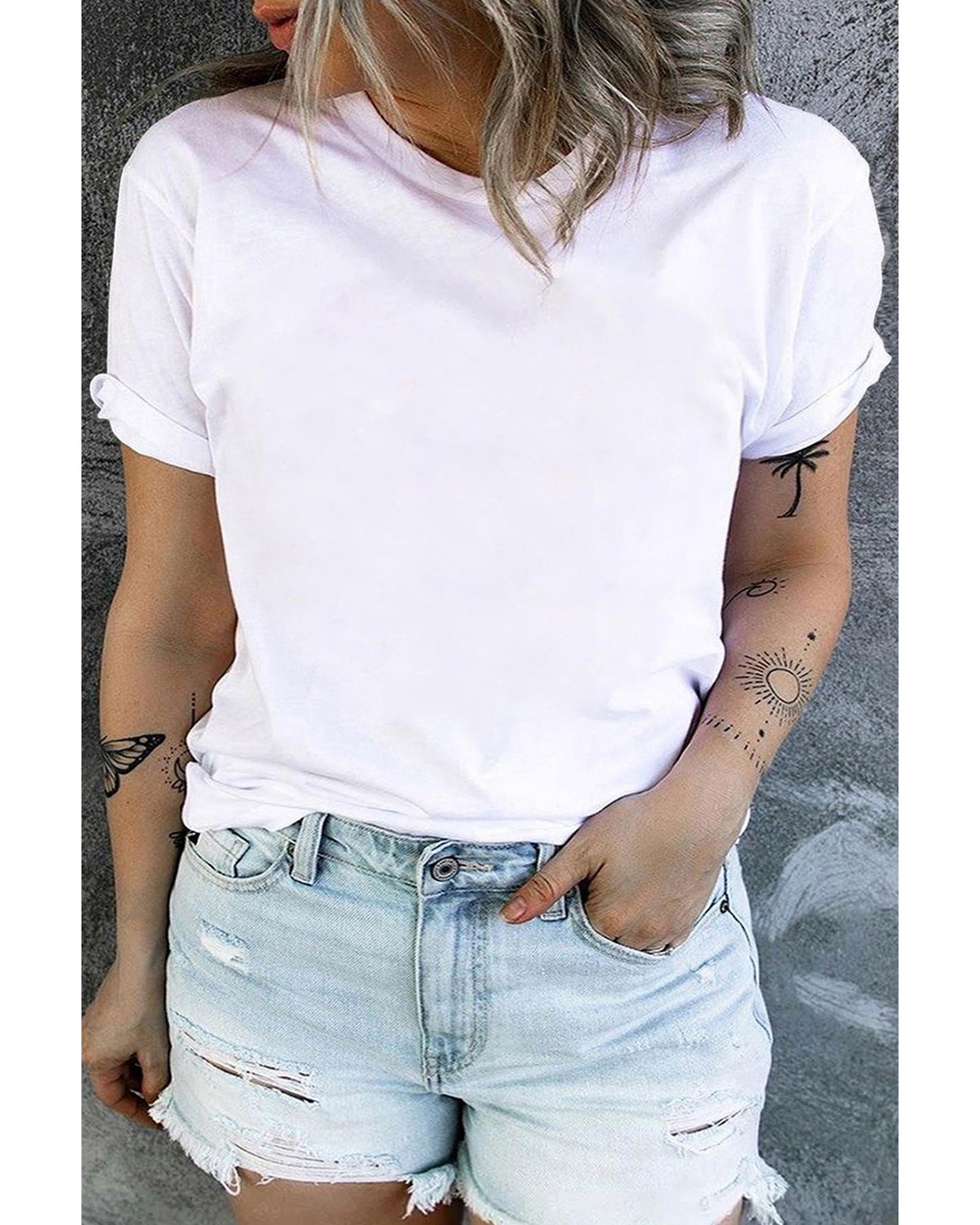This white round neck T-shirt features rolled sleeves and a relaxed, comfortable fit. Designed with a trendy, flattering silhouette, it is suitable for plus size wearers and easy to style for various occasions. Available in multiple colors, it offers a versatile addition to your wardrobe.
