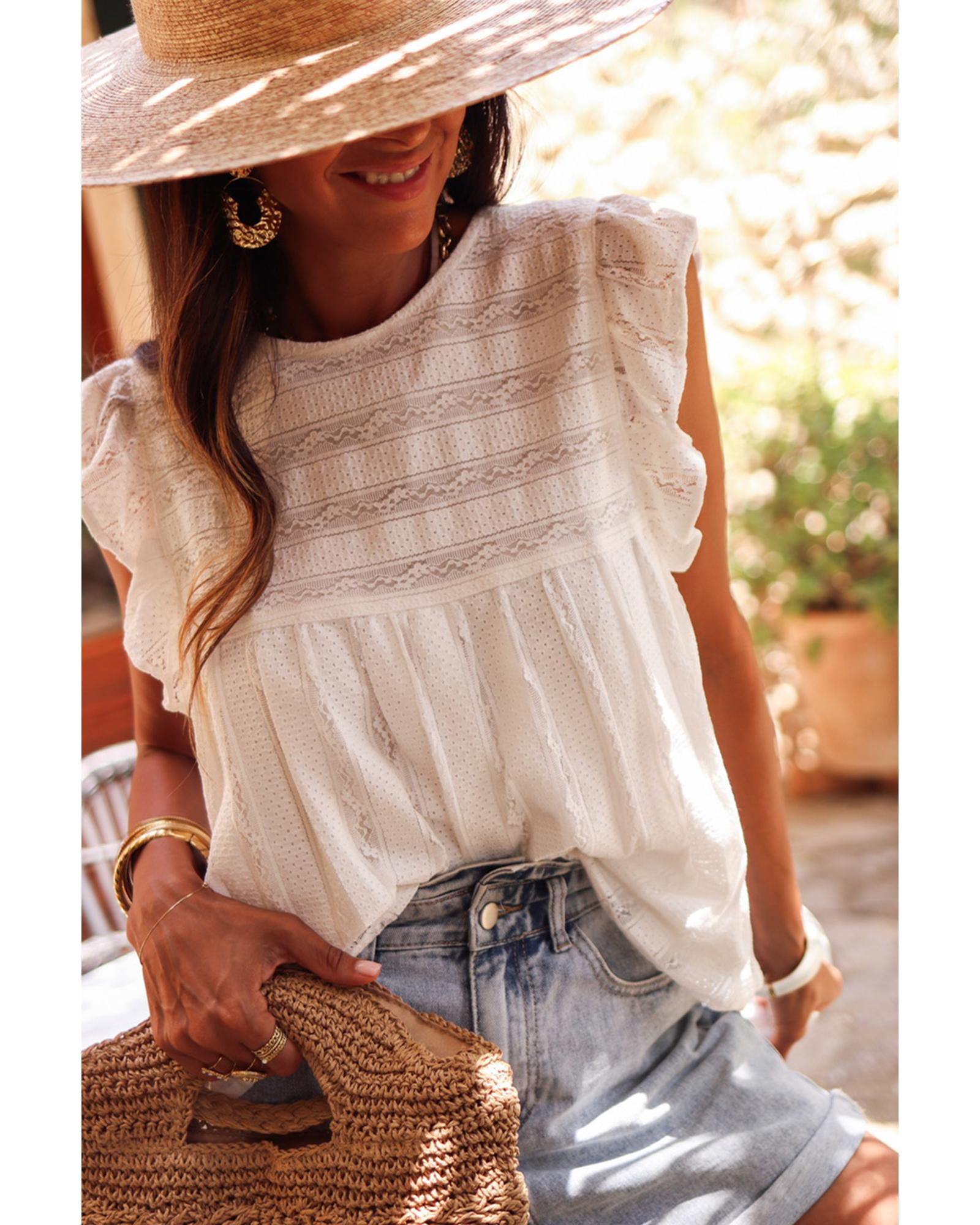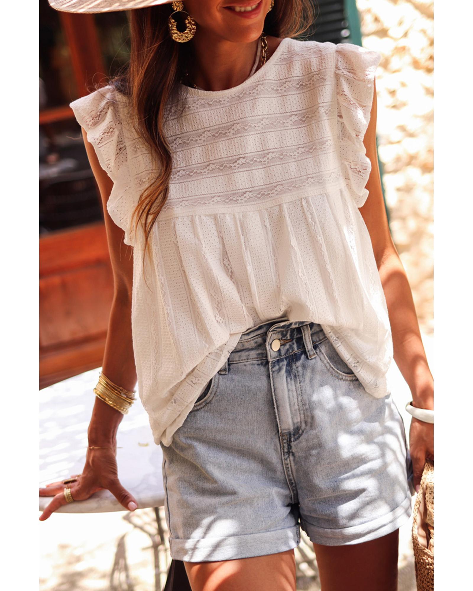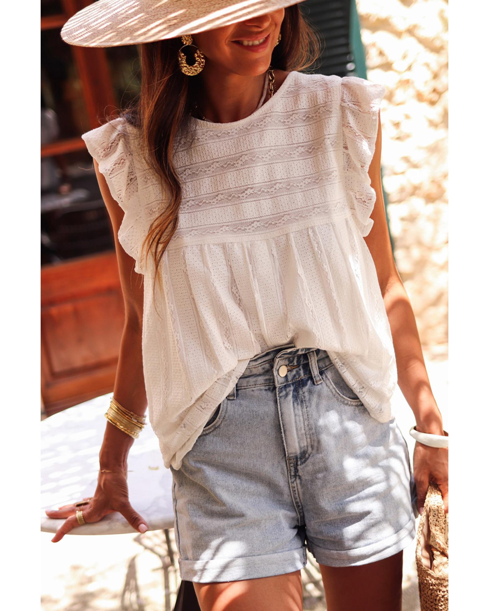 This white ruffled lace flowy tank top offers a feminine and stylish look with delicate lace detailing and ruffled accents. Designed with a trendy fitted silhouette, it combines comfort and durability, making it suitable for various occasions.