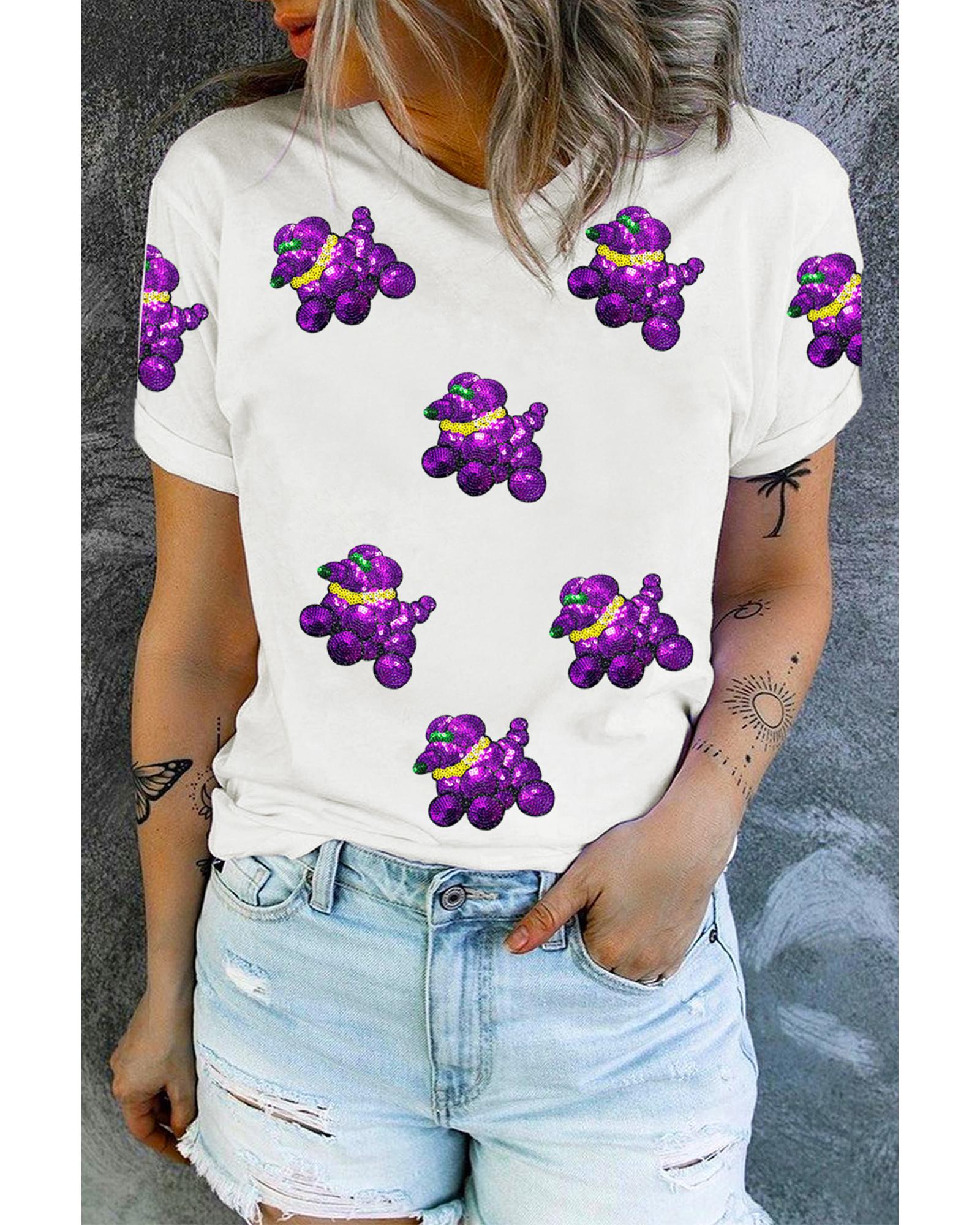 This festive Mardi Gras tee features a playful balloon puppy graphic adorned with sparkling sequin details. Designed with a trendy fitted style, it offers a comfortable fit suitable for various casual occasions. The short sleeves and crew neck provide a classic look that pairs well with jeans or shorts for a casual, chic appearance.