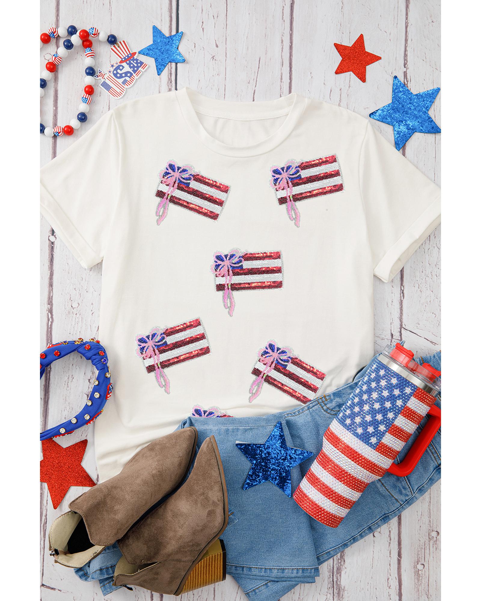White Sequin Bow American Flag Patched T Shirt – 3XL