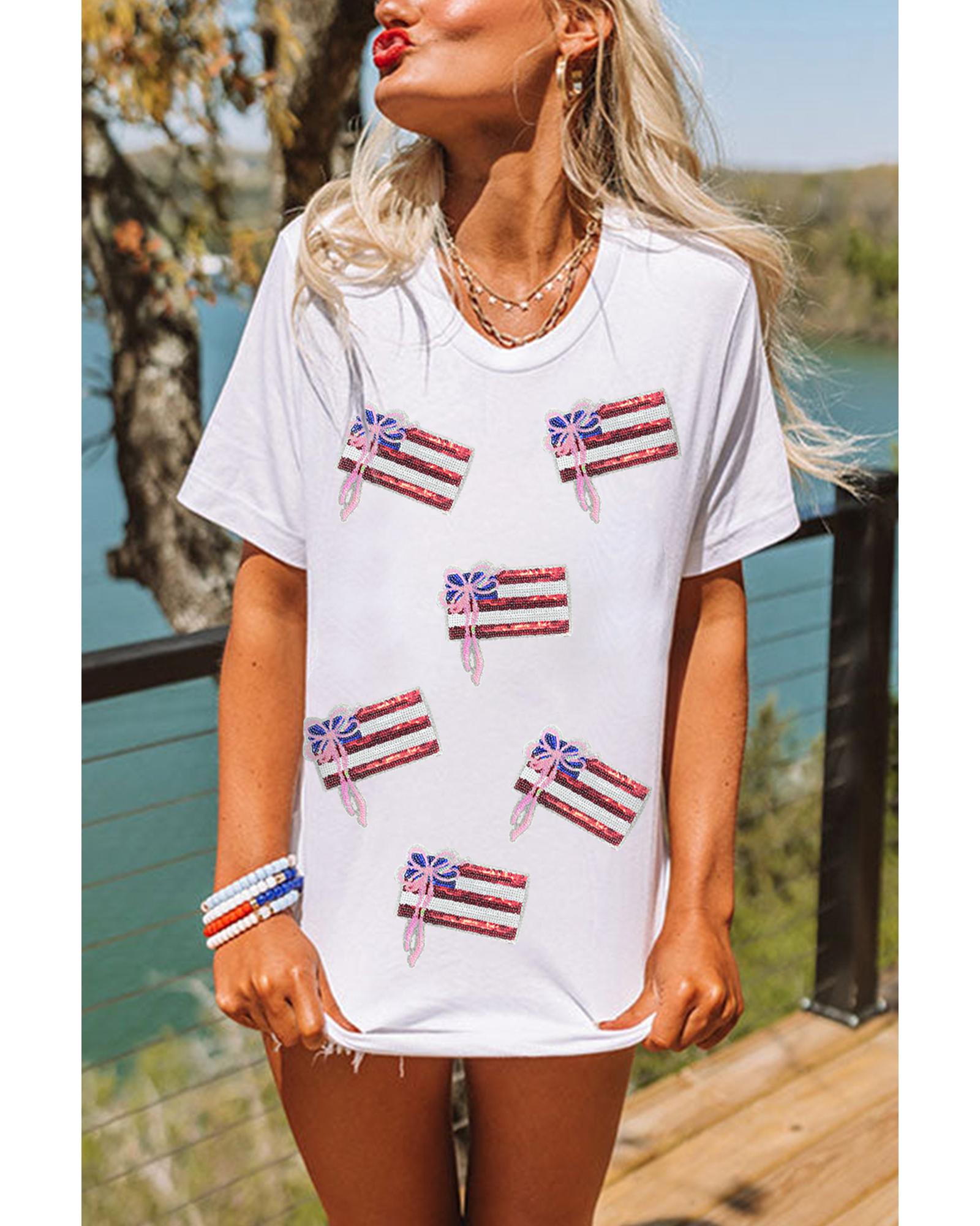 This T-shirt features a stylish sequin bow and eye-catching American flag patches, making it a patriotic and fashionable choice. Crafted from soft and comfortable fabric, it is suitable for all-day wear and easy to pair with jeans or shorts for a casual, stylish look.