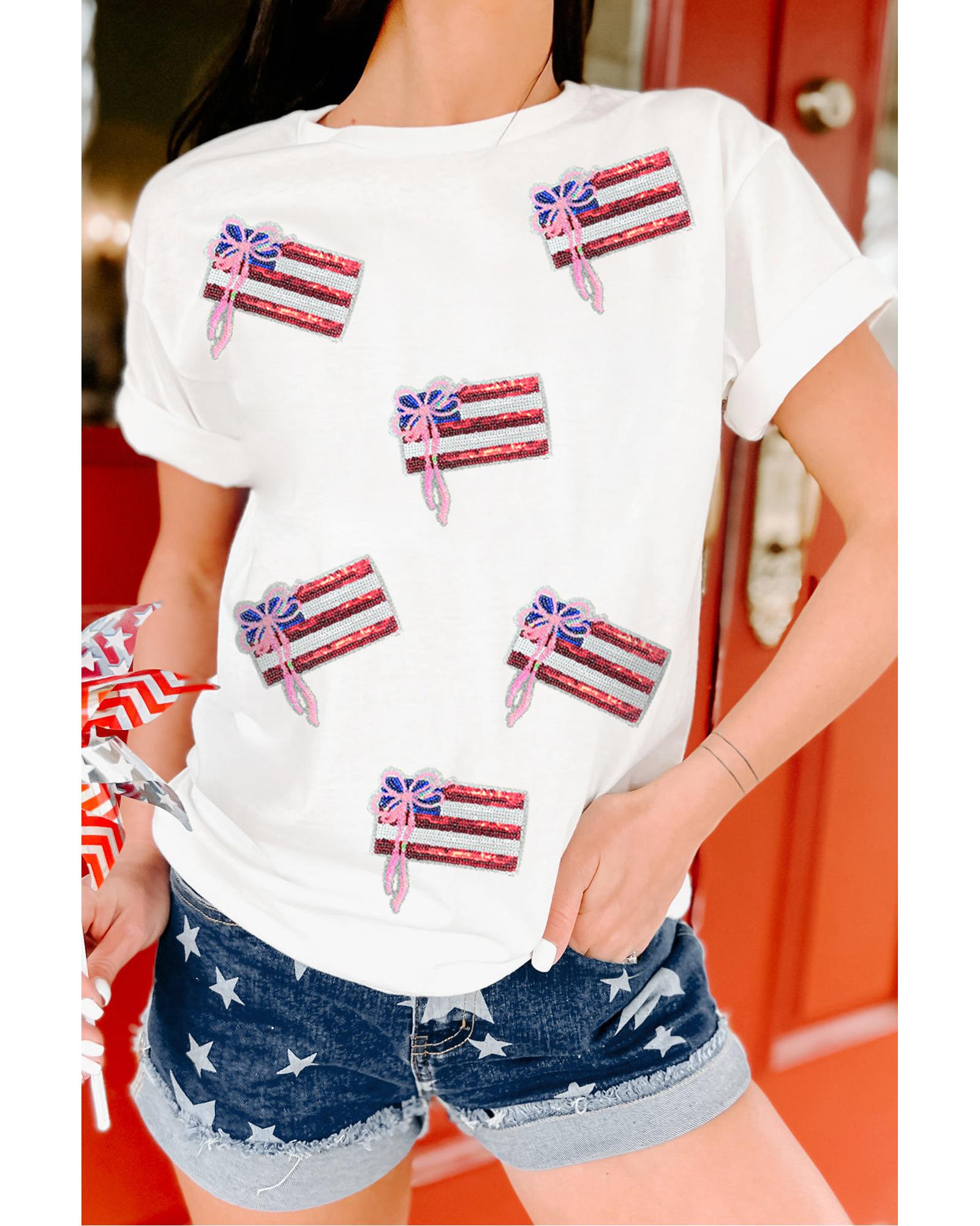 This T-shirt features a stylish sequin bow and eye-catching American flag patches, making it a patriotic and fashionable choice. Crafted from soft and comfortable fabric, it is suitable for all-day wear and easy to pair with jeans or shorts for a casual, stylish look.