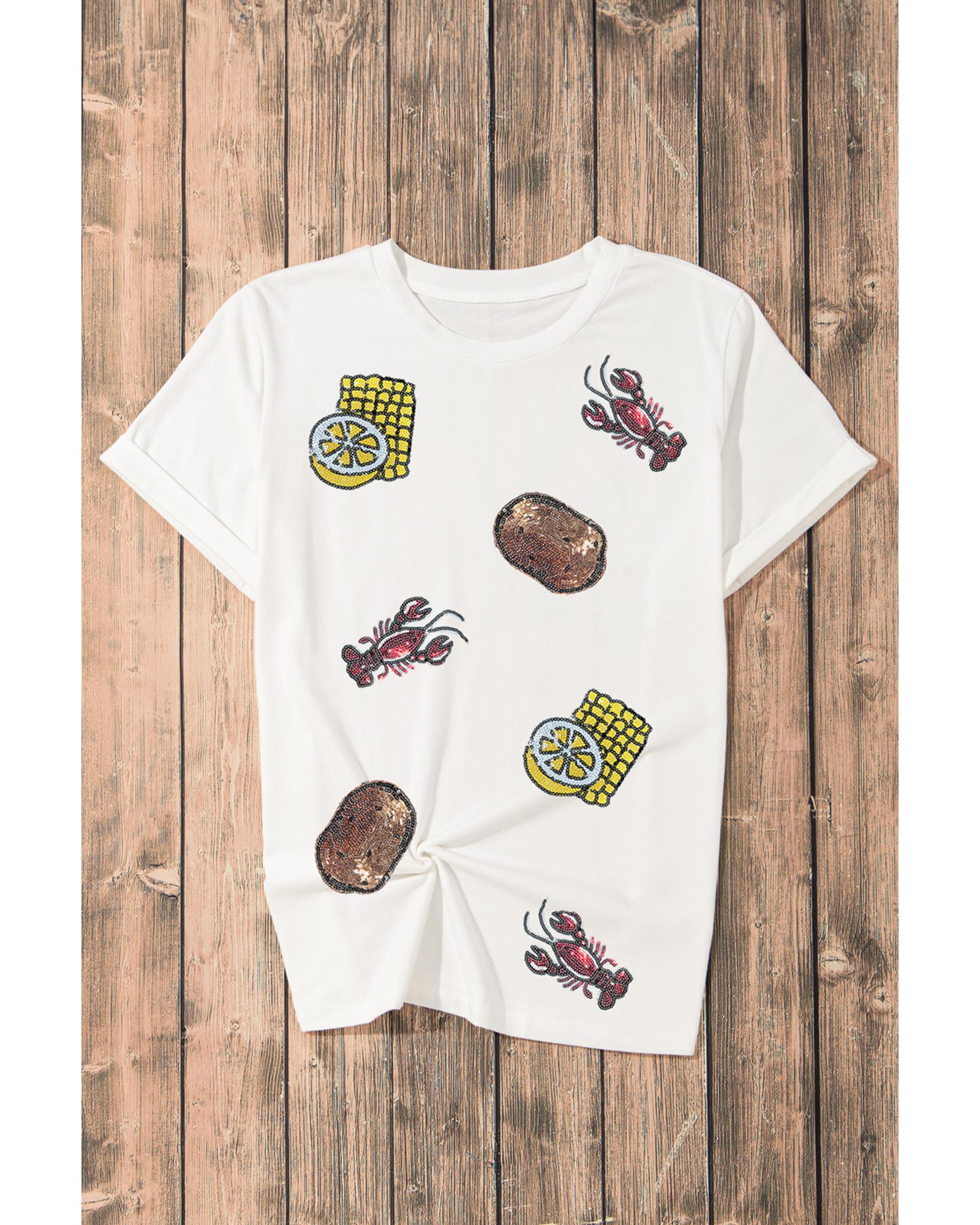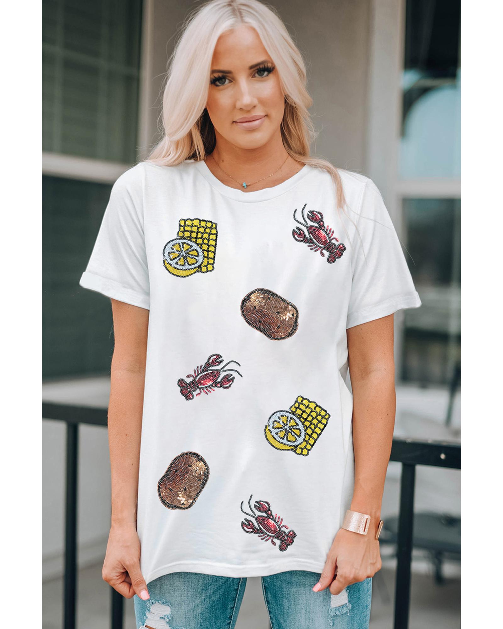 This T-shirt features a playful graphic design with crawfish, corn, lemon, and potatoes, accented with sequins for added sparkle. It is ideal for festive occasions and can be styled with jeans, shorts, or skirts. The shirt is available in multiple sizes and offers a true-to-size fit for comfortable wear.