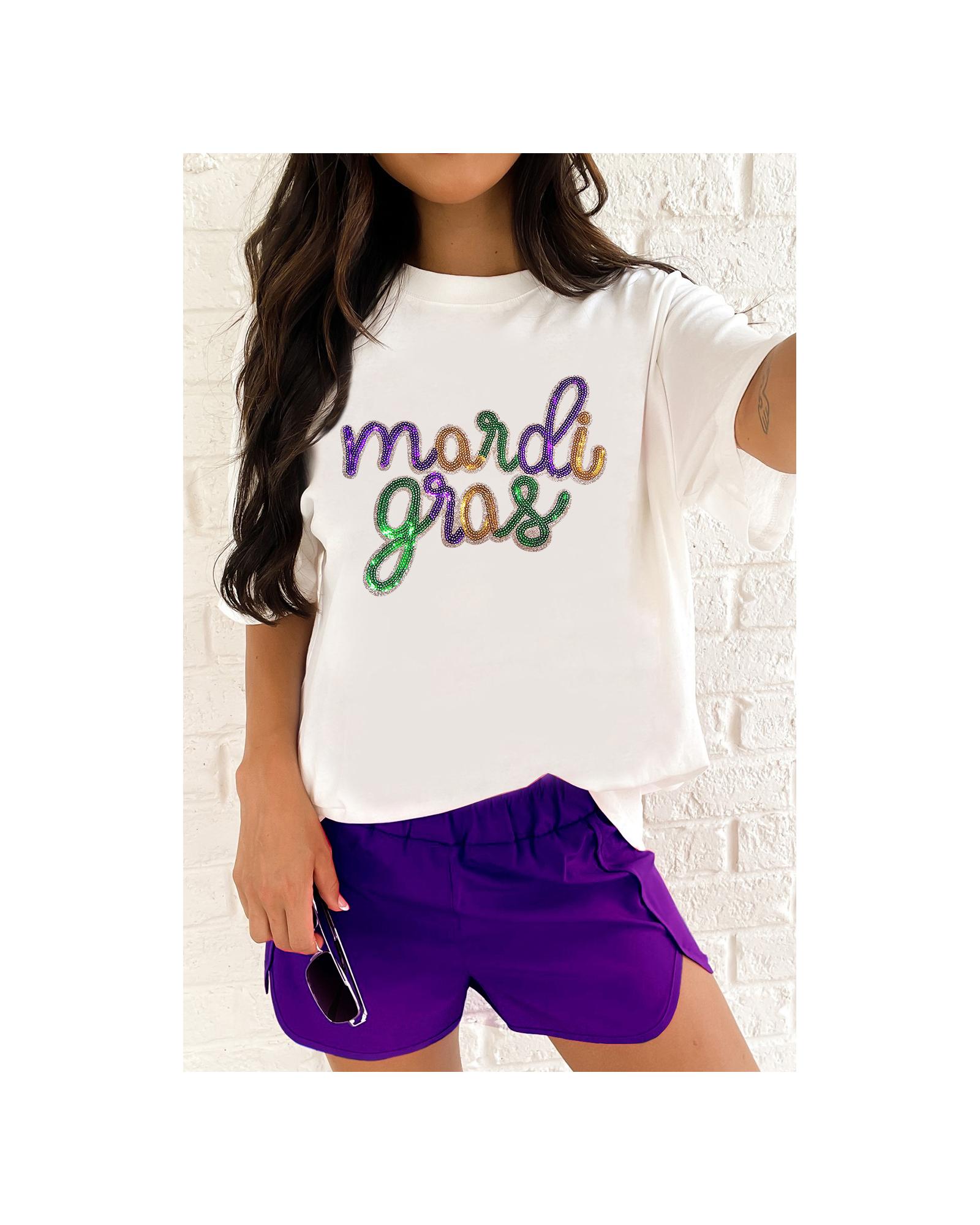 This white sequin Mardi Gras graphic T-shirt combines a festive design with a comfortable fit, making it suitable for various casual occasions. The shirt features shiny sequin graphics that add a lively and celebratory touch, complemented by a classic crewneck and short sleeves for all-day comfort. Available in plus sizes, it offers inclusive sizing options to suit different body types.