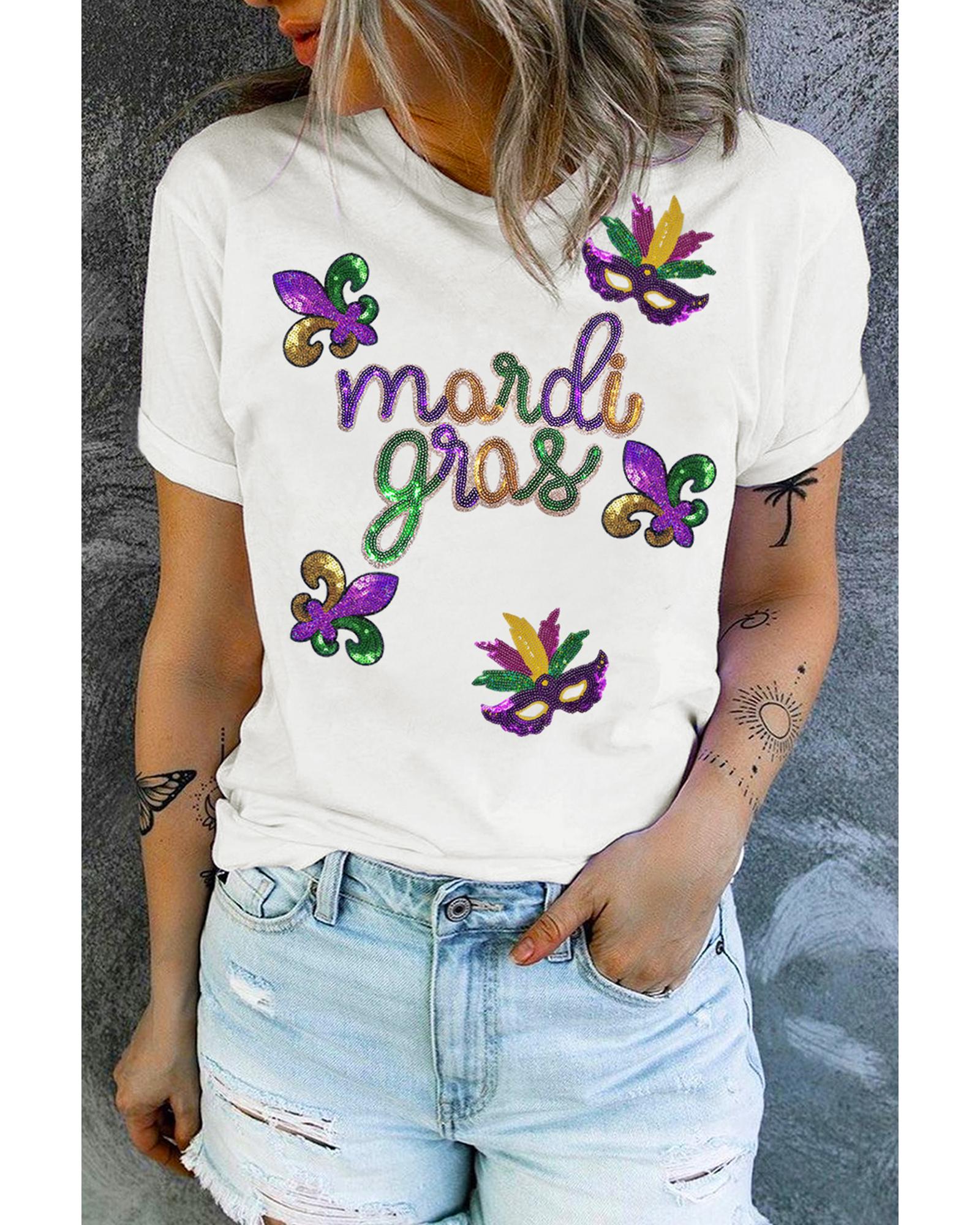 White Sequin Mardi Gras Pattern Graphic Crew Neck Tee – 2XL