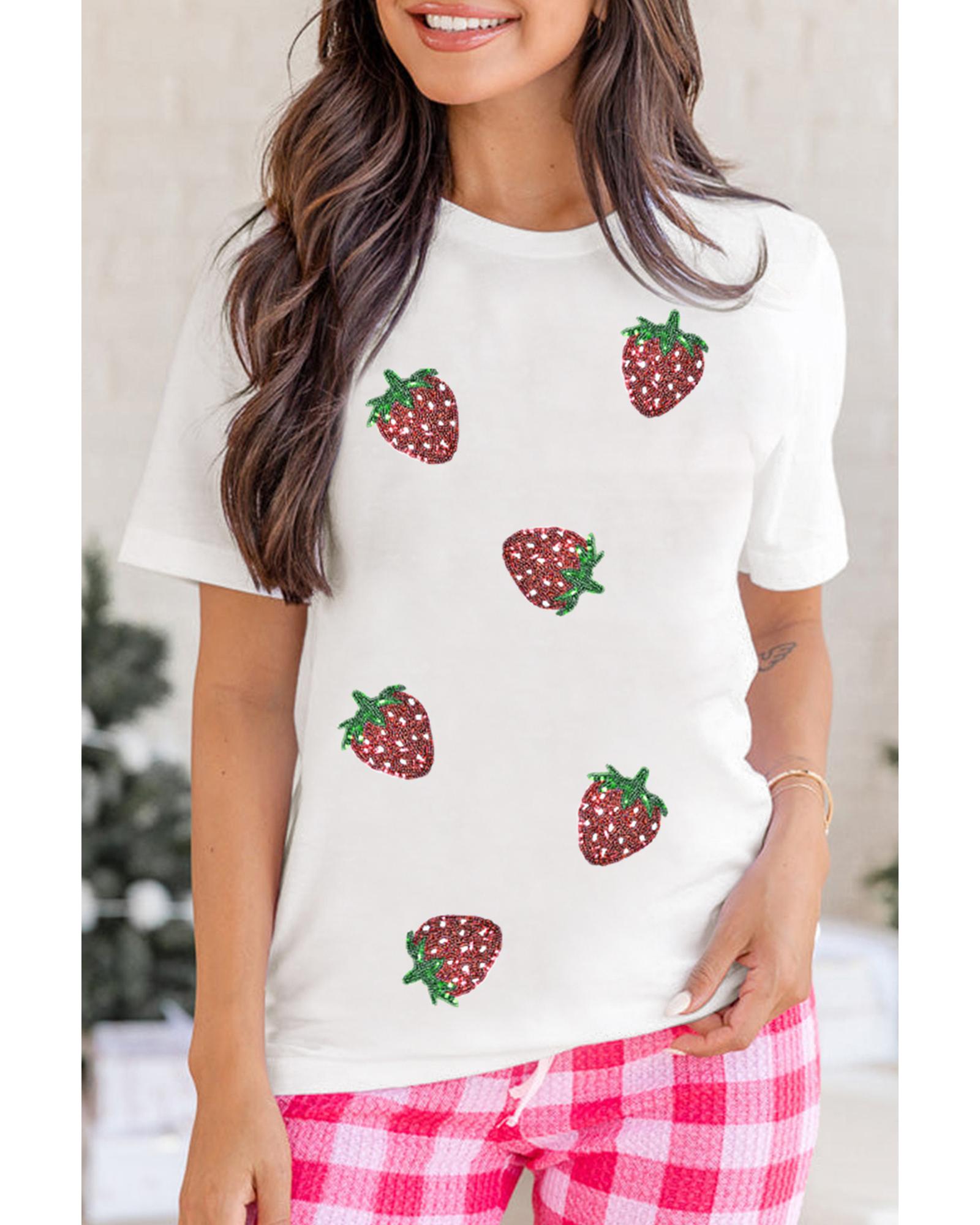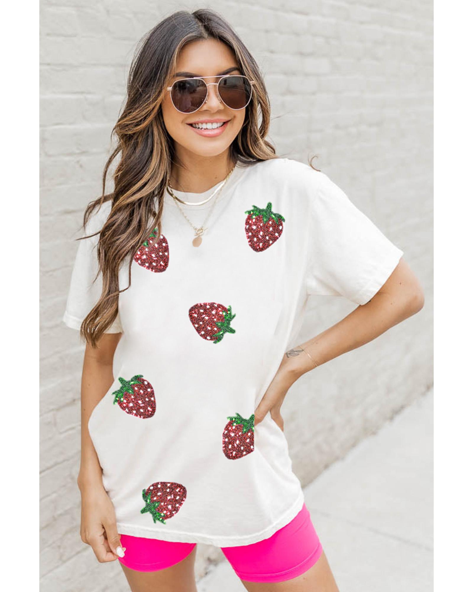 This white sequin strawberry patched crew neck T-shirt combines playful design with comfort, making it suitable for casual wear. The shirt features charming strawberry patterns embellished with sequins, adding a touch of sparkle. Made from a soft, breathable fabric, it ensures all-day comfort with a relaxed fit. The classic crew neck and short sleeves contribute to its laid-back style, perfect for pairing with jeans or shorts for a fun and stylish look.