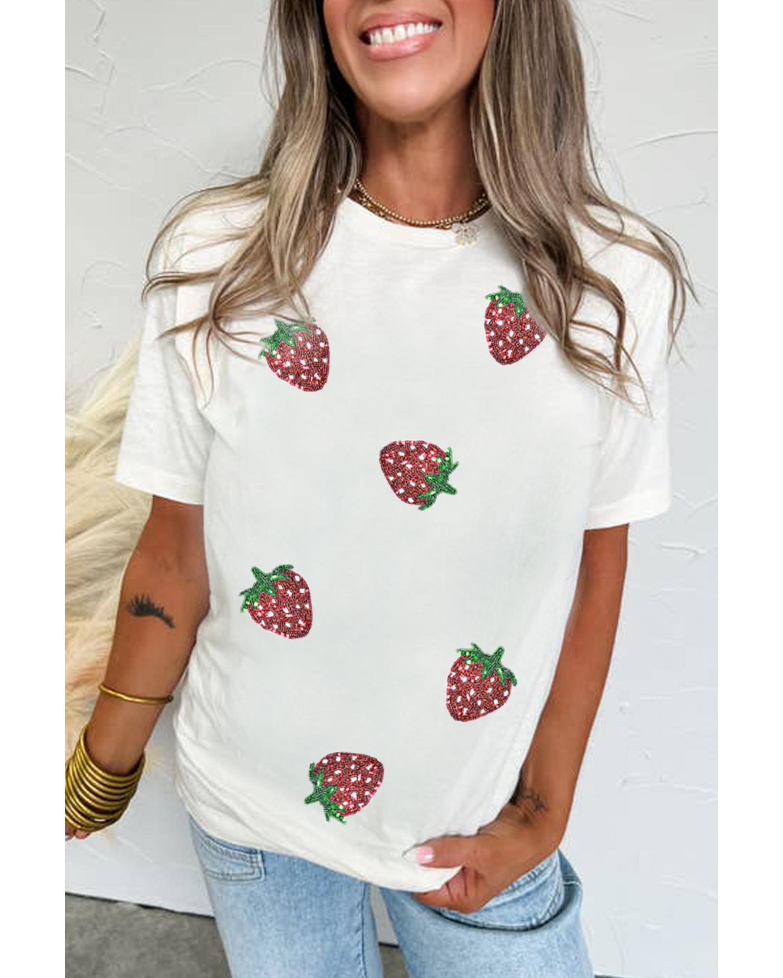 White Sequin Strawberry Patched Crew Neck T Shirt – XL