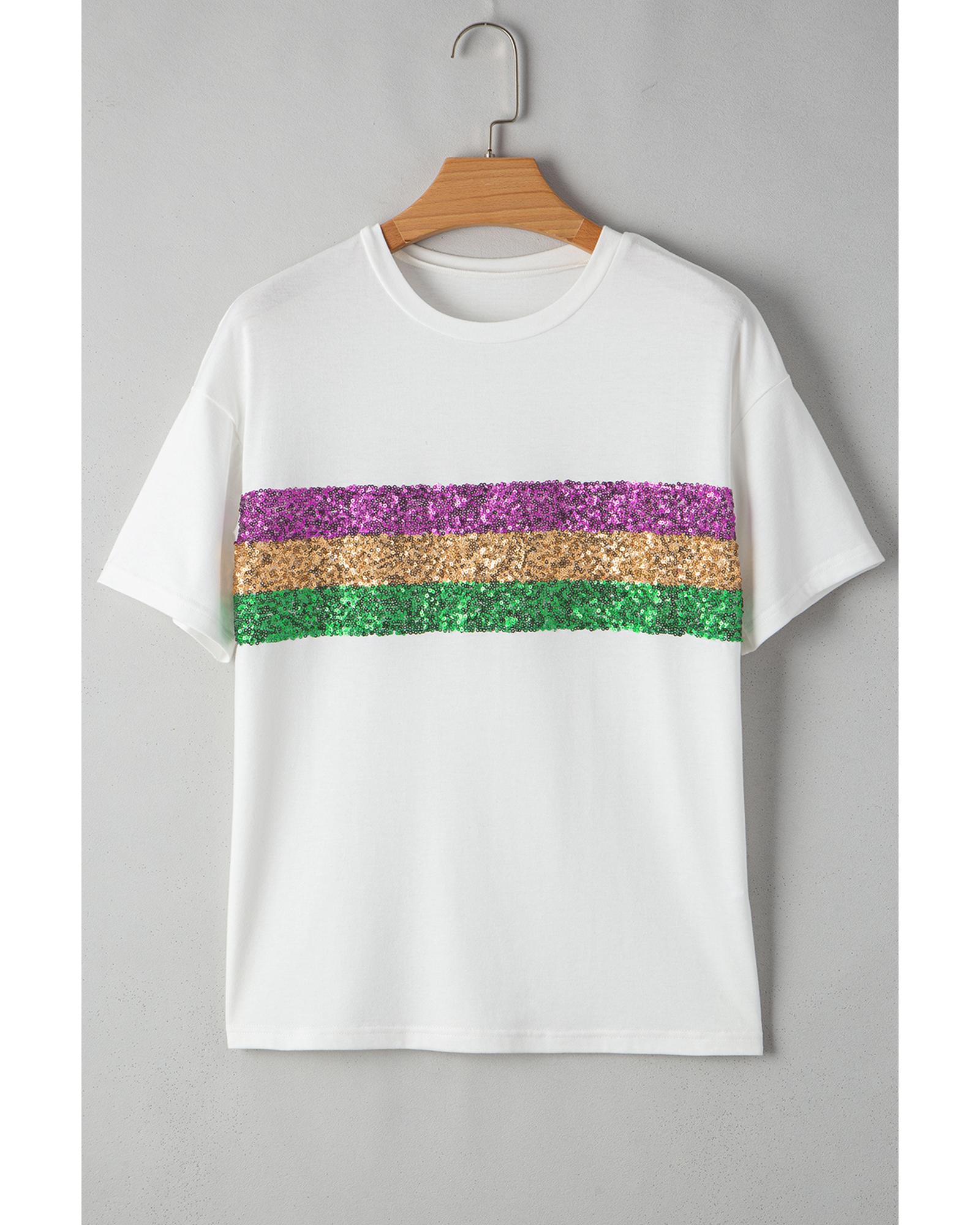 This White Sequin Stripes Patchwork Mardi Gras Crew Neck T Shirt combines a festive design with a trendy fitted silhouette. Perfect for celebrations, it features a classic crew neck and versatile style that pairs easily with various pants and shorts.