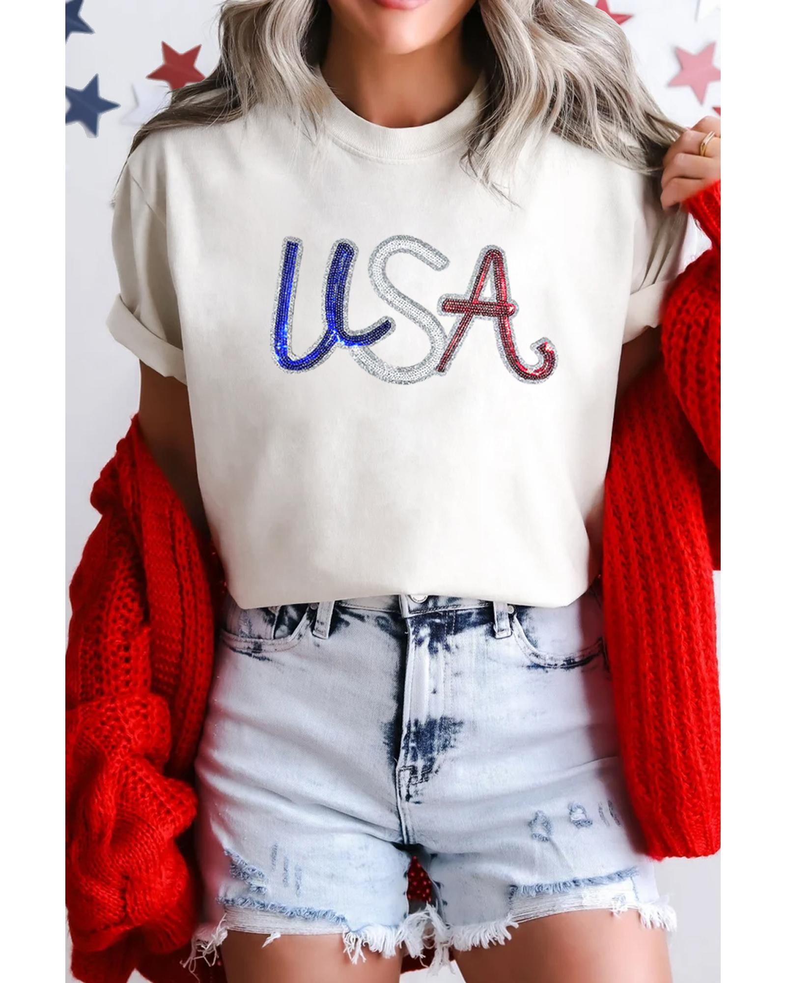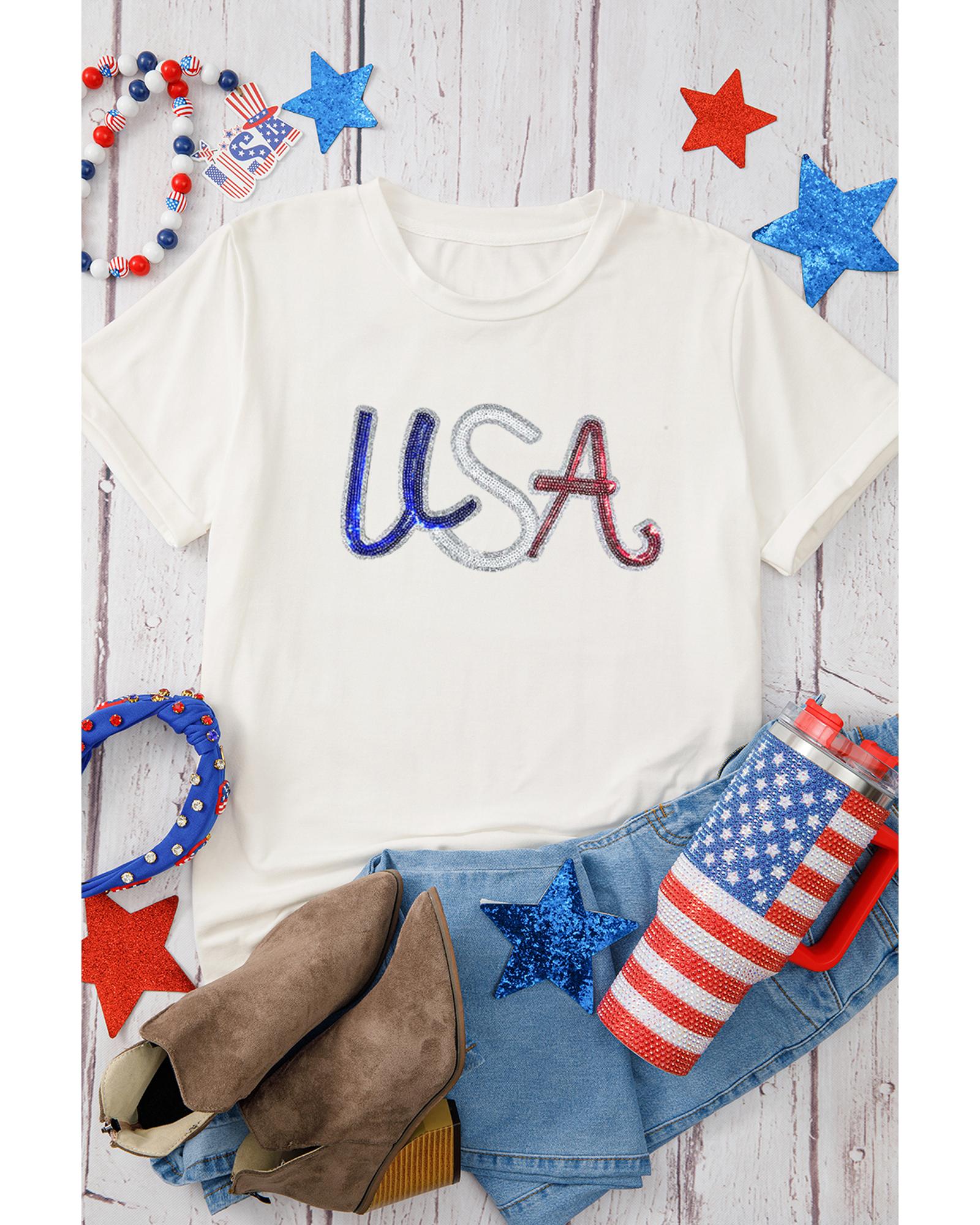 White Sequin USA Graphic Crew Neck Patriotic Tee – M