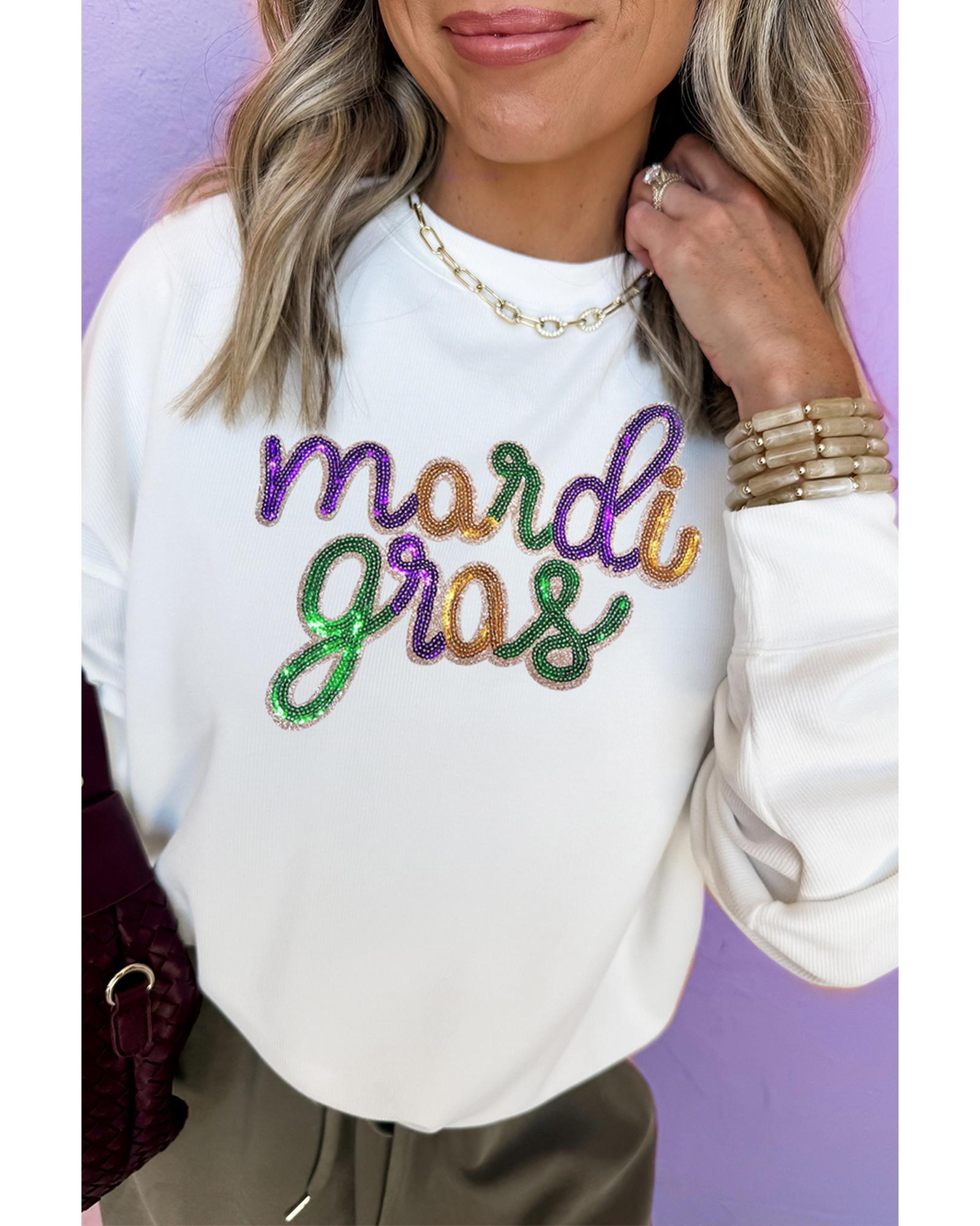 White Sequined mardi gras Graphic Crew Neck Drop Shoulder Sweatshirt – L