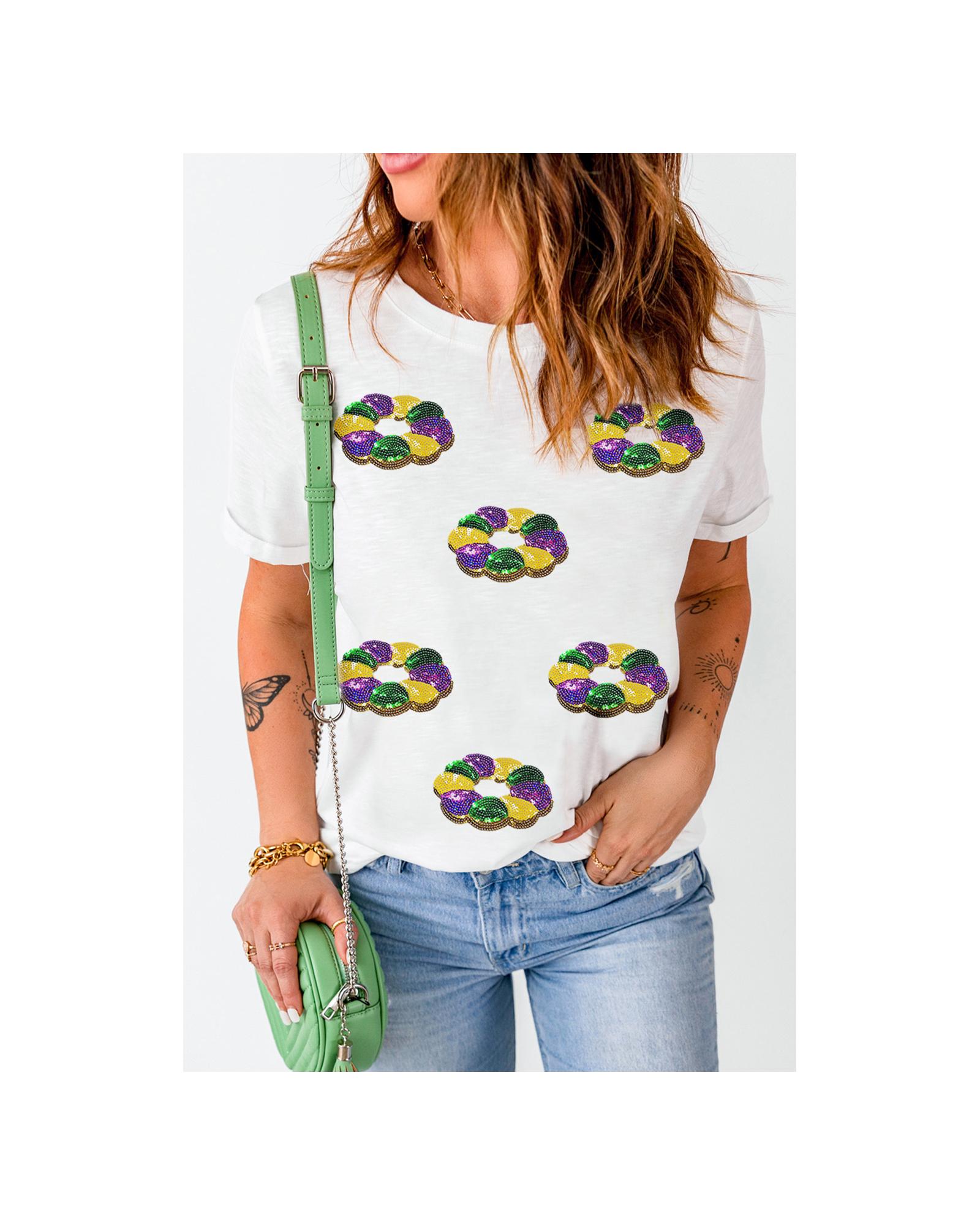 This white sequined top features a festive Mardi Gras pattern, designed with a trendy fitted silhouette. It offers a stylish and comfortable fit suitable for various occasions. The top is made from a blend of polyester, cotton, and elastane, providing both durability and stretch.