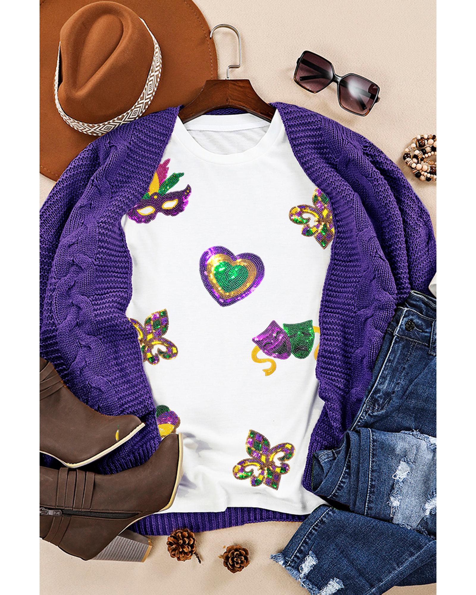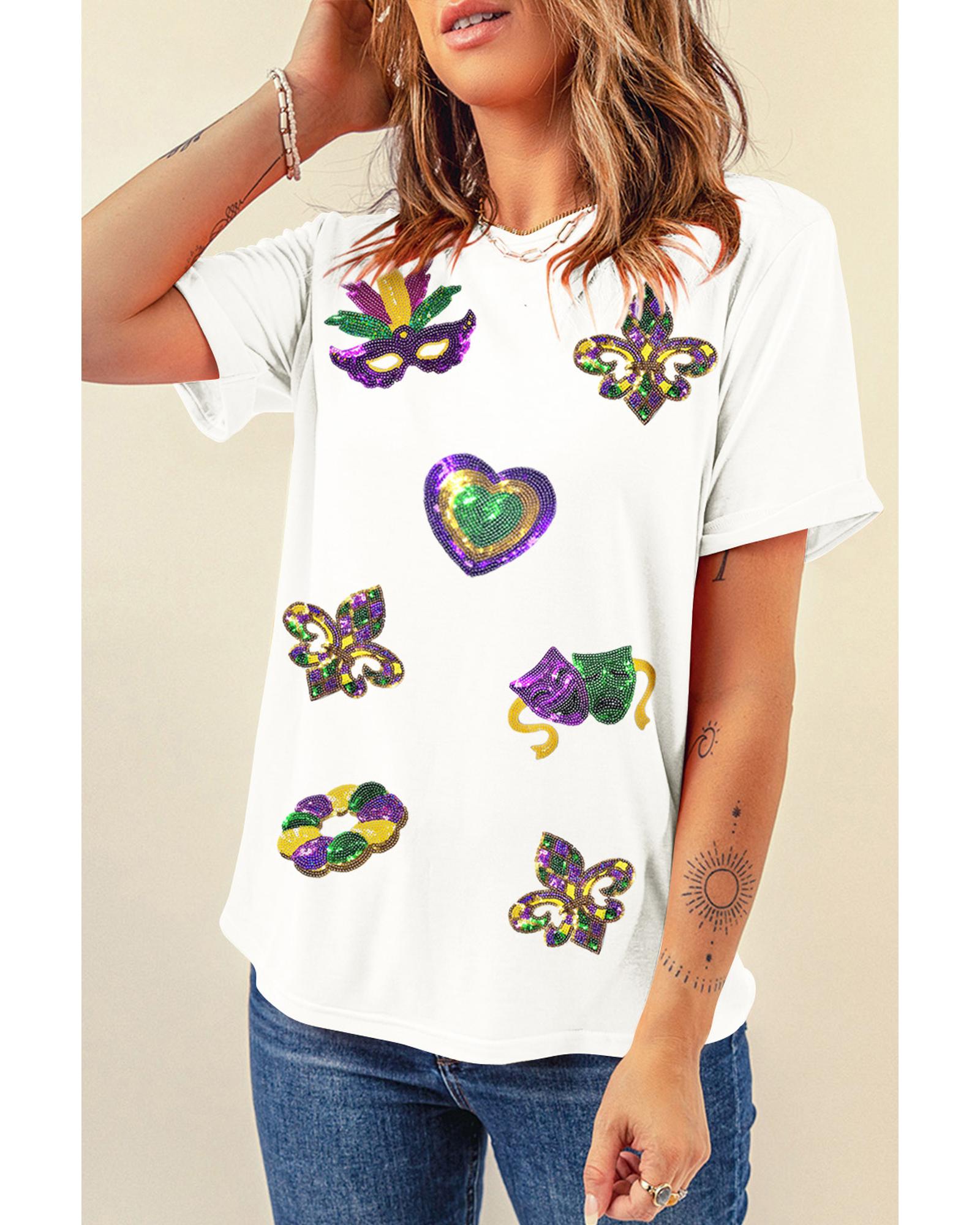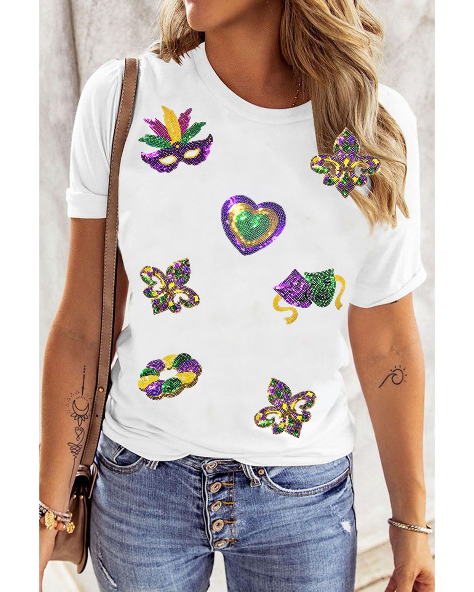 This casual tee features a white sequined Mardi Gras symbolic pattern, adding a shiny and festive touch to your outfit. Designed with a trendy fitted look, it is suitable for both special occasions and everyday wear. The versatile style pairs well with skirts and denim shorts, making it a great addition to your wardrobe.