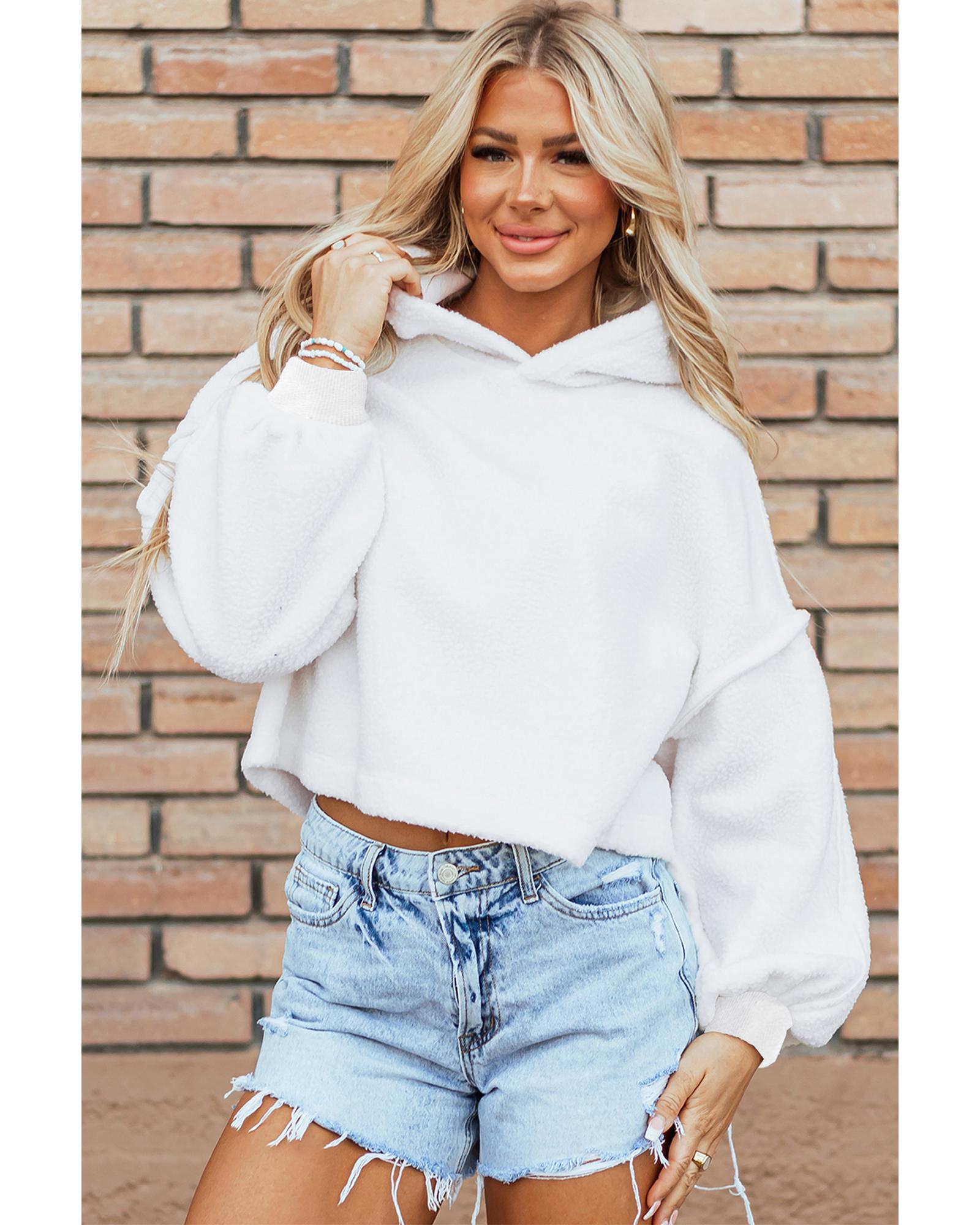 This white sherpa fleece drop shoulder hoodie combines comfort and style, making it ideal for casual outings and lounging. Its trendy design features a relaxed fit with exposed seam details, crafted from soft and warm sherpa fleece fabric for all-day comfort.