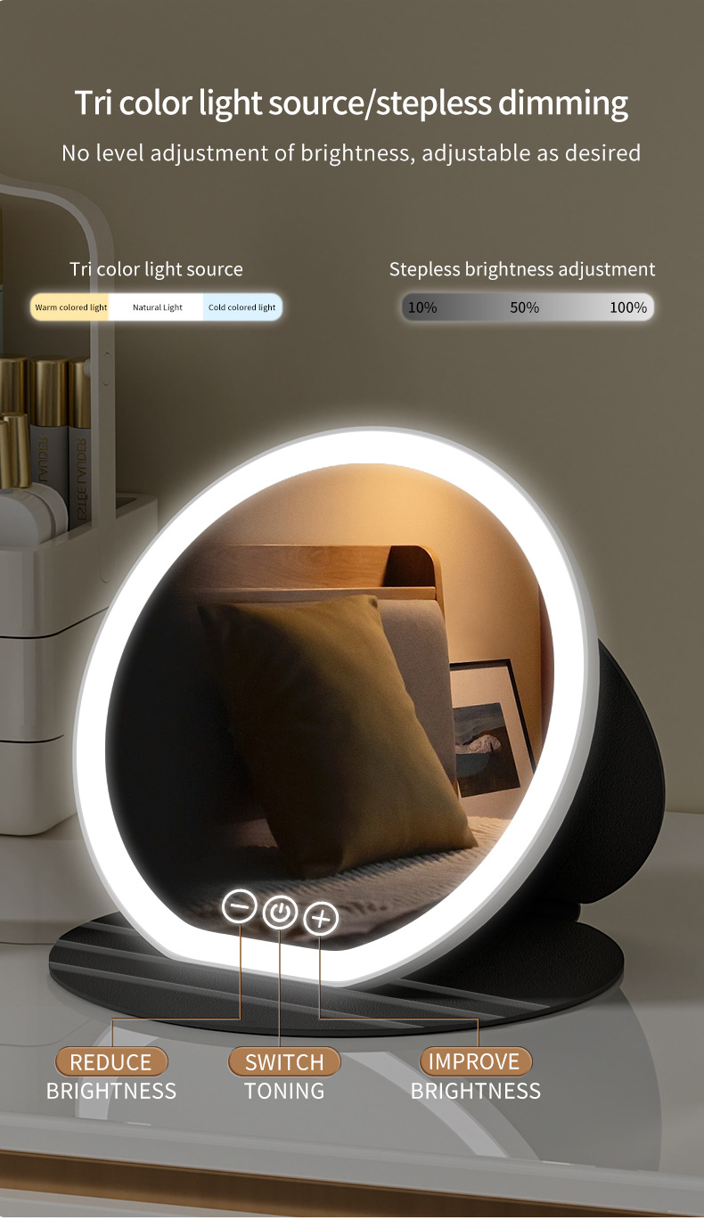 This small round foldable LED makeup mirror offers adjustable lighting and a compact design, making it ideal for detailed makeup application and grooming. Its versatile features include customizable light settings, a large high-definition mirror, and a foldable structure for easy storage and portability.
