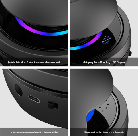 - Functions: Rope rotation, jump counting, Bluetooth speaker, adjustable speed, LED lights