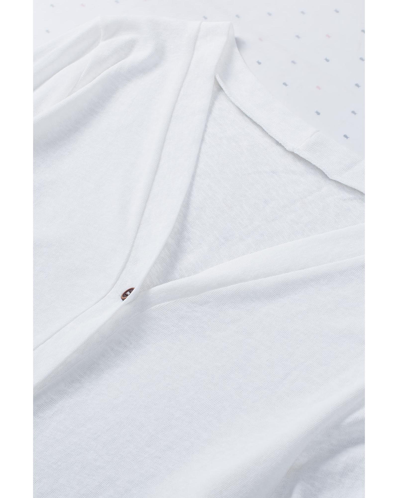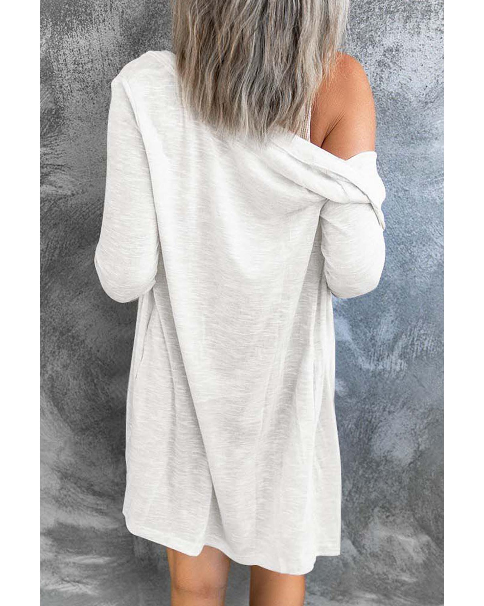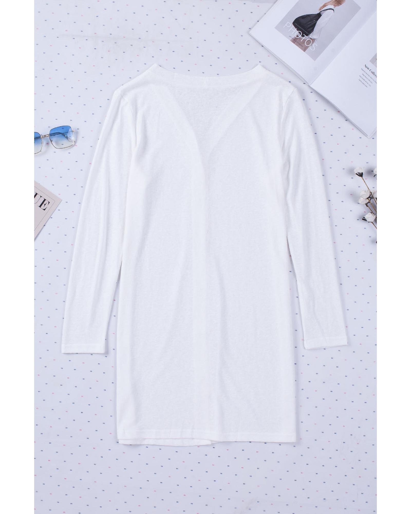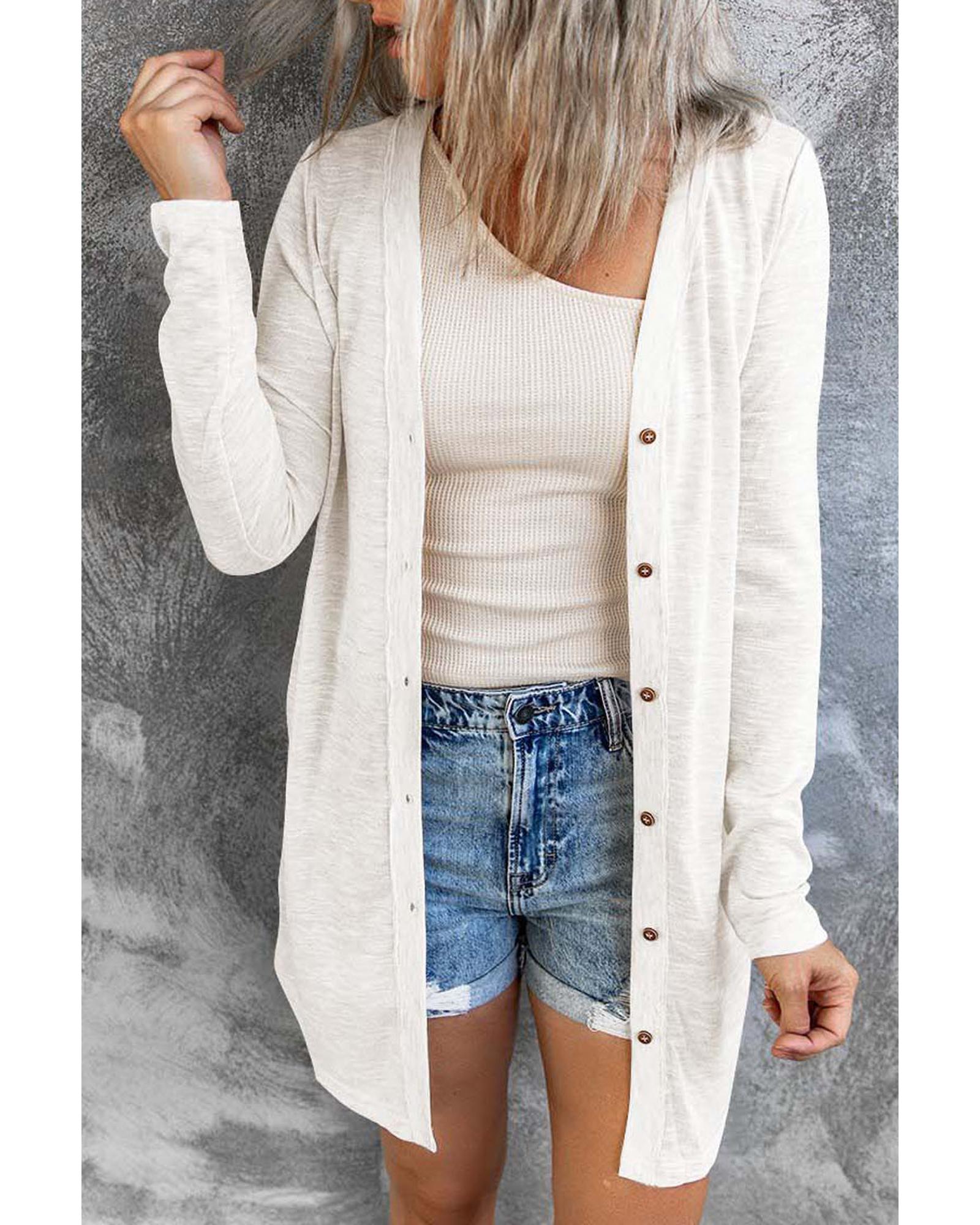 This open-front cardigan features a classic white solid color design with button closures, making it a versatile addition to your wardrobe. Its loose fit and longline style provide a comfortable and flattering silhouette suitable for various body types. Crafted from lightweight materials, it is ideal for layering during early autumn and warm spring days, pairing effortlessly with tees, vests, and casual pants.