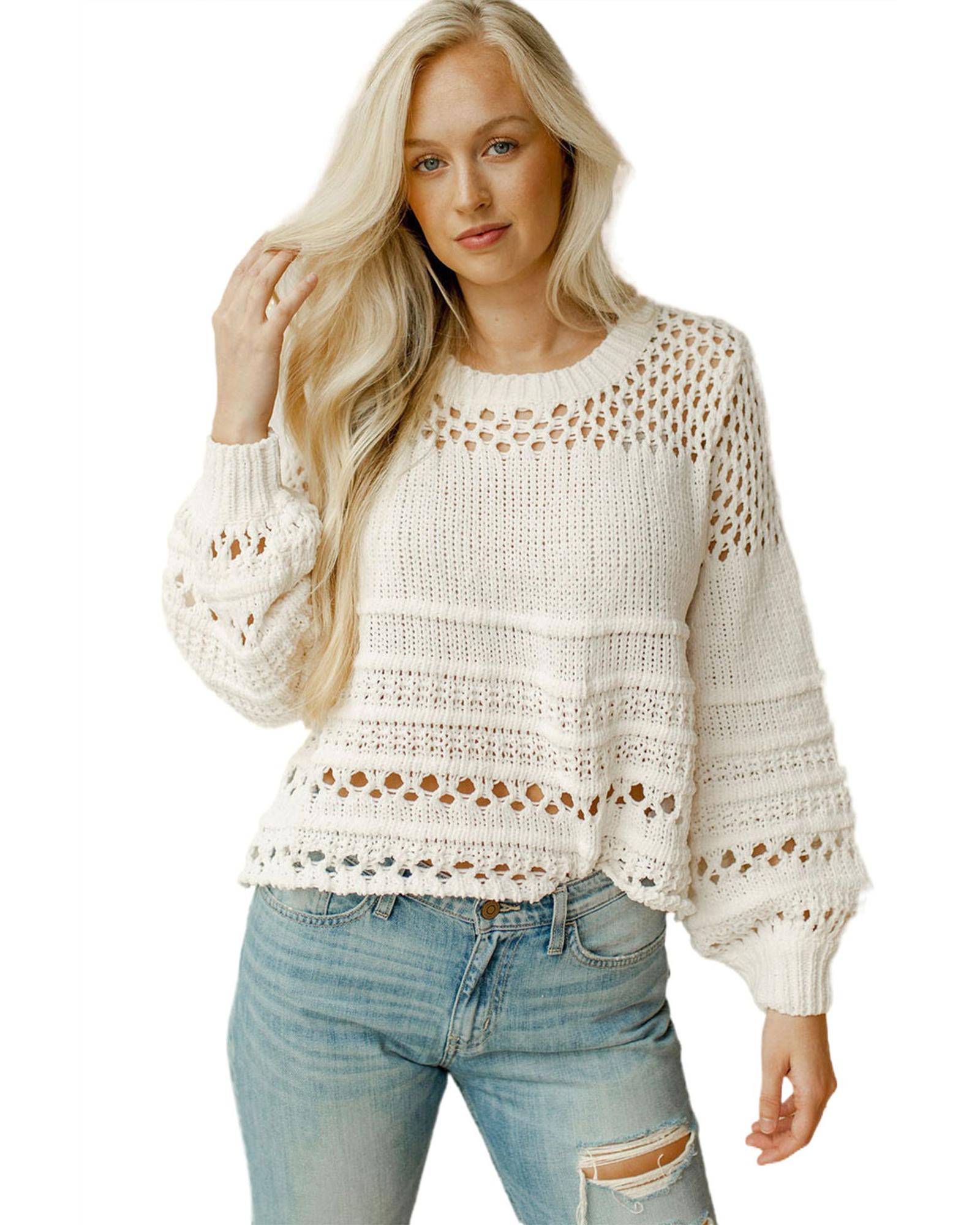 - Design: Pointelle knit with hollow details and puff sleeves