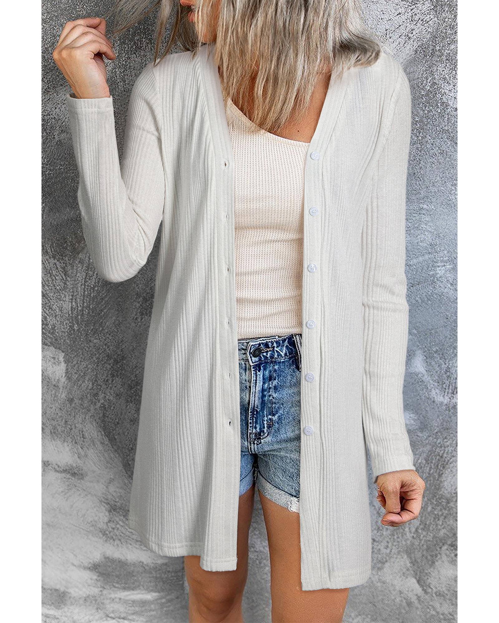 White Solid Color Ribbed Button up Tunic Cardigan – S